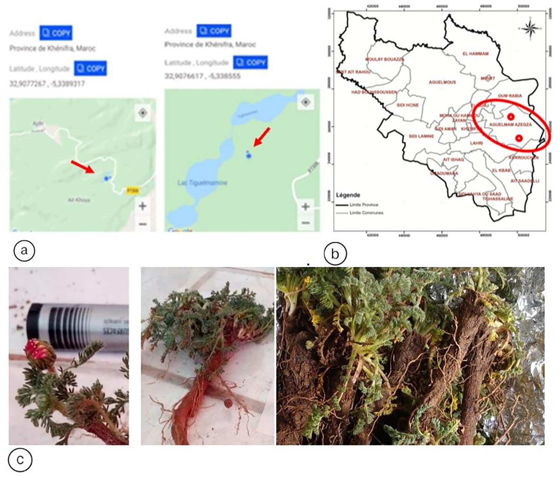 Figure 1. (a) Administrative division of the Beni Mellal-Khenifra region (Morocco), with a focus on Khenifra Province. (b) Biogeographic location of the sampling sites 1 & 2. (c) Morphological appearance: Flowers, ray florets and root of Anacyclus pyrethrum var.pyrethrum “Igendas” roots.