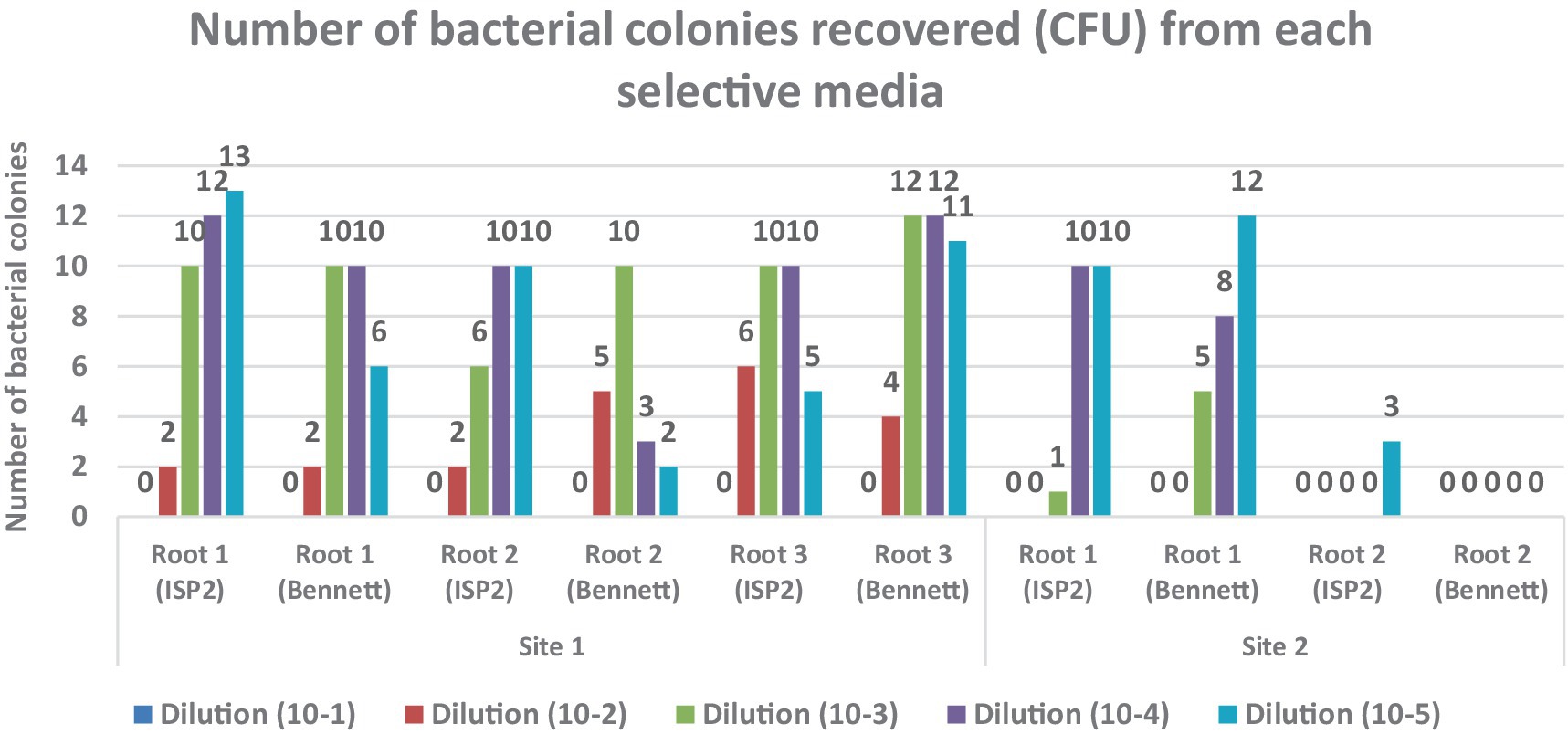 A comparison between samples from two sites 1 and 2 revealed a significant difference in endophytic bacterial abundance. Root samples from Site 1 showed substantial bacterial growth on both ISP2 and Bennett media, with the highest CFU counts at intermediate dilutions.