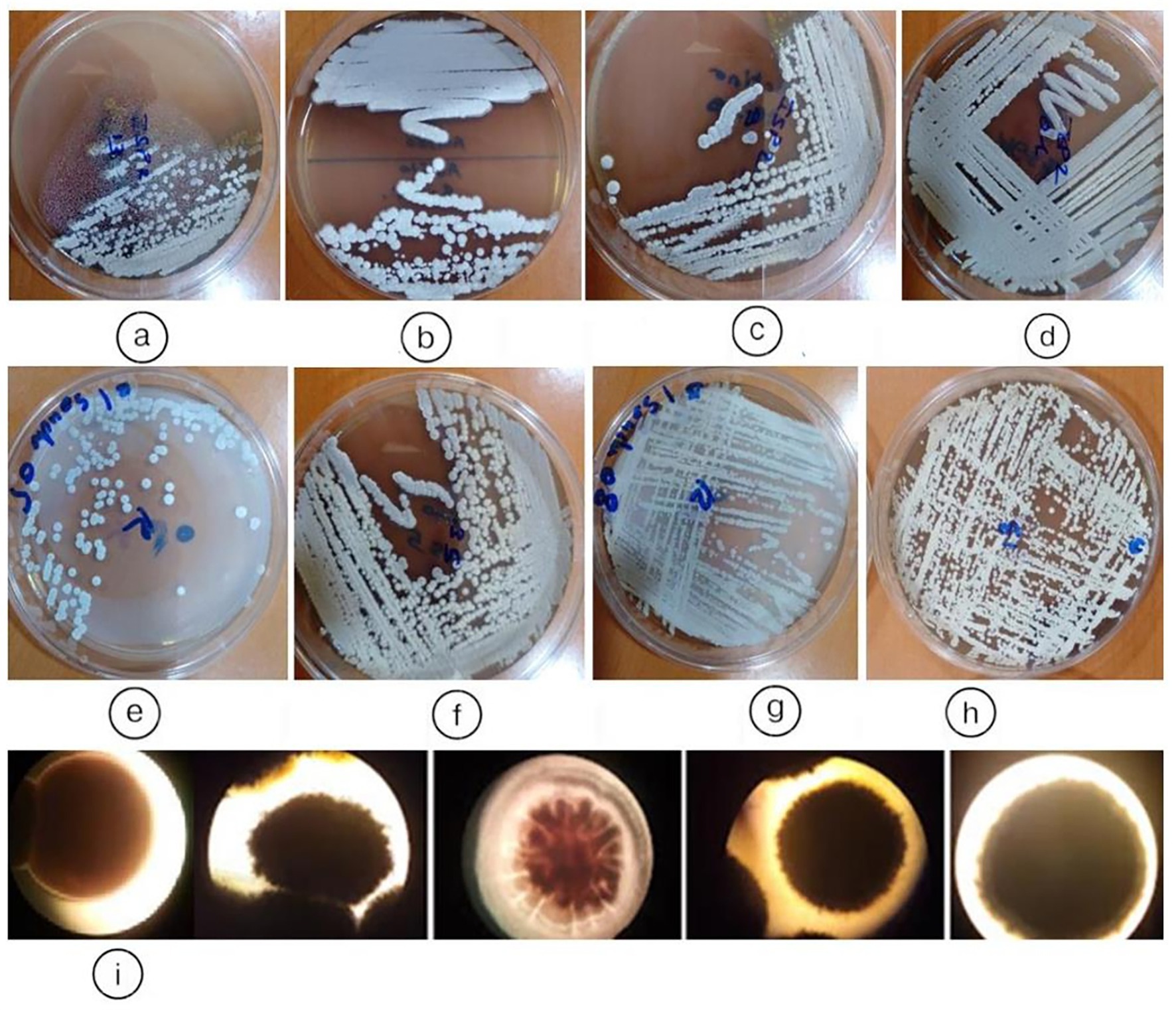 Figure 3. Representative colony morphologies of endophytic actinobacteria isolates from Anacyclus pyrethrum roots, grown on ISP2 medium at 28 °C for 7 days: (a) AGS13; (b) AGS3; (c) AGS9; (d) AGS 1; (e), (f) AGS5 (By5a); (g) AGS8 (By8); (h) AGS10 (By10); (i) macroscopic appearance of colonies of endophytic actinobacteria.