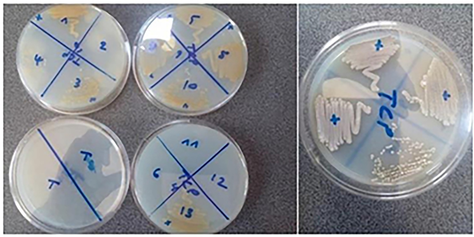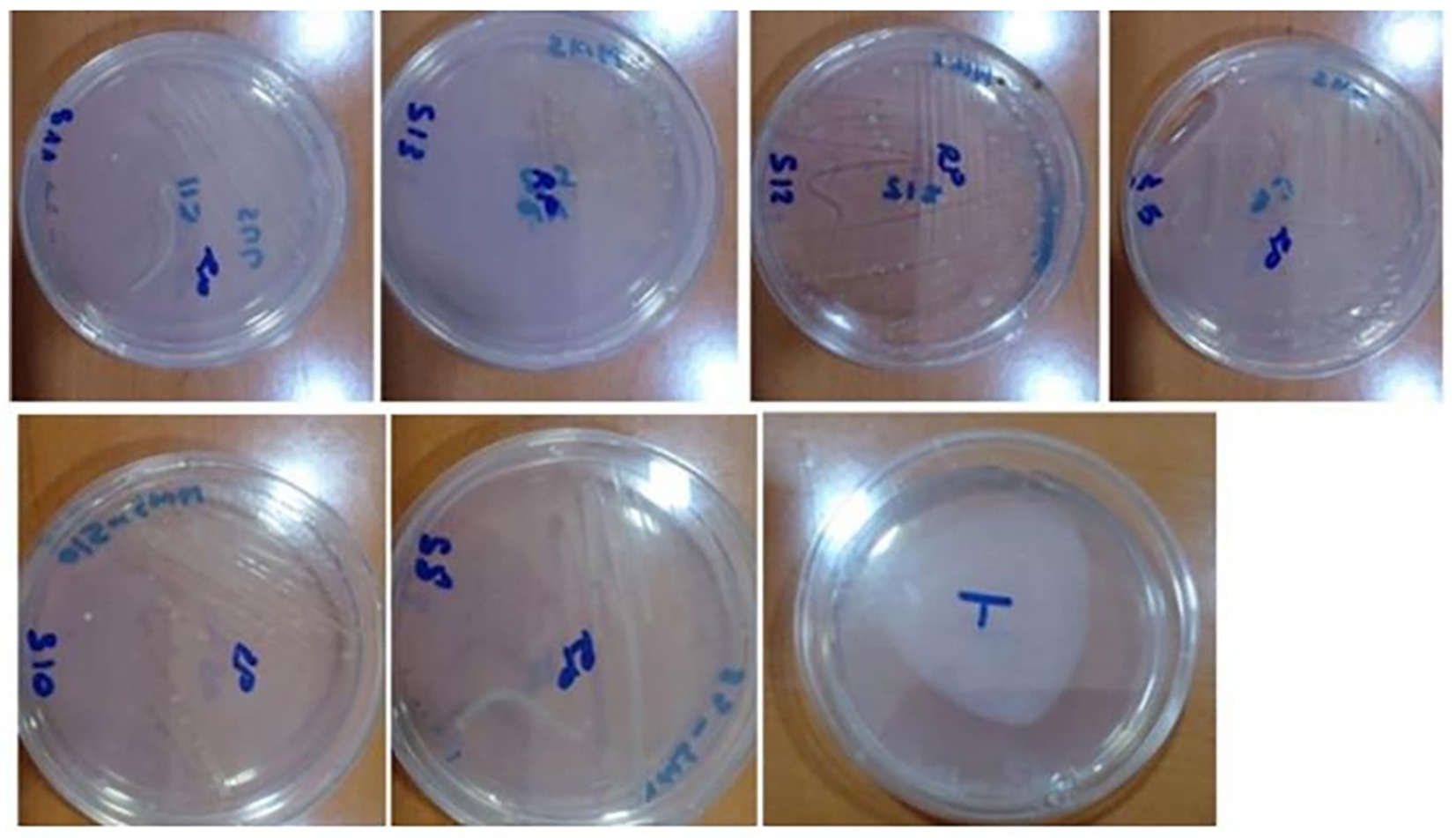 Figure 4. Tri-Calcium Phosphate (TCP) Solubilization by Endophytic Actinobacteria. The figure illustrates the phosphate-solubilizing ability of selected endophytic actinobacterial isolates (AGS1, AGS3, AGS4, AGS5, AGS8, AGS9, AGS10, and AGS13) grown on solid Synthetic Minimum Medium (SMM) supplemented with 0.5 g/L TCP. After incubation in 7 days, the strains seeded in tight streaks in solid SMM containing TCP are developed.