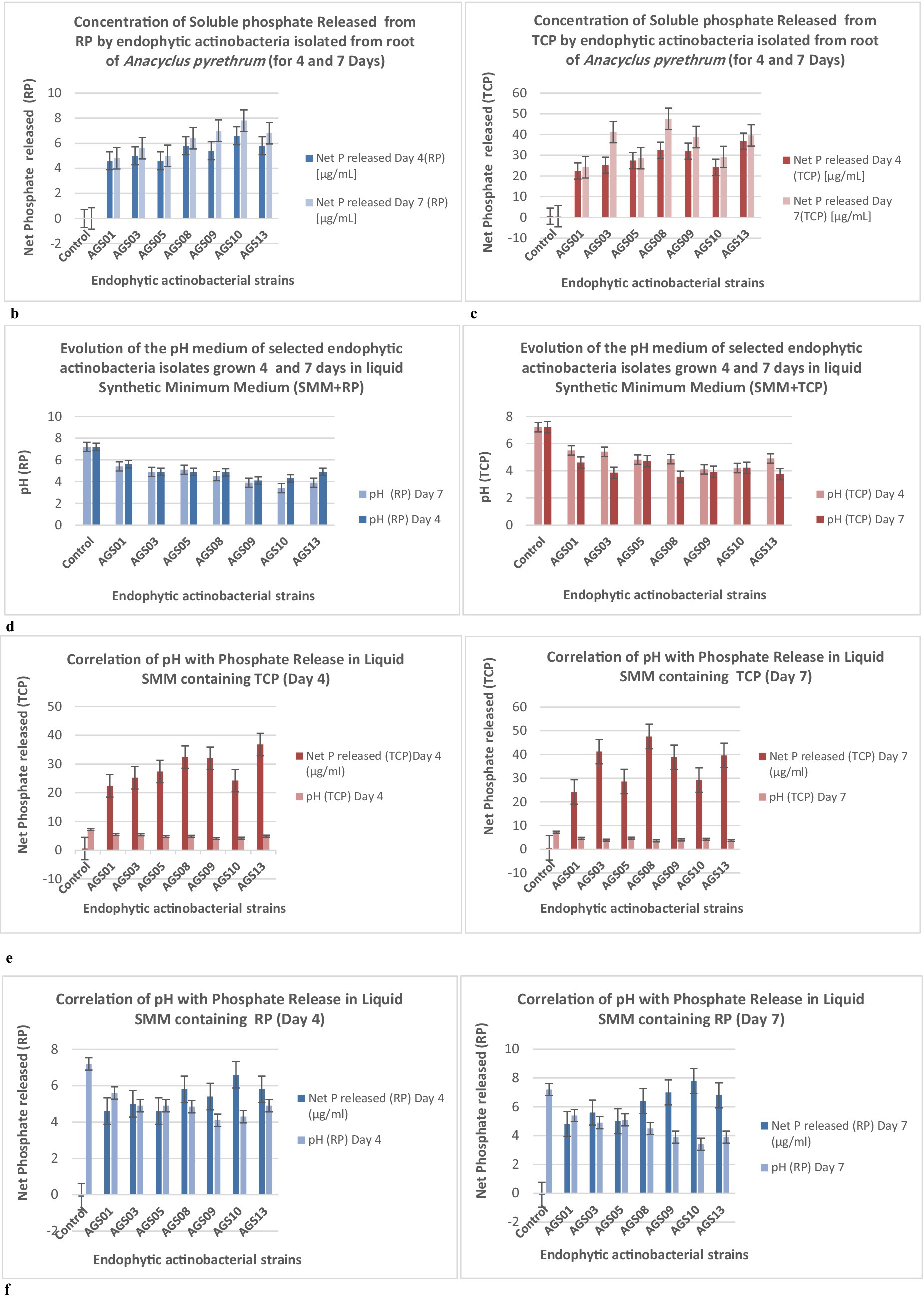 Figure 6. (b) Soluble phosphate released (μg/mL) from Tri-Calcium Phosphate (TCP) by endophytic actinobacteria isolates in SMM (0.5 g/L TCP) after 4 and 7 days. Controls are non-inoculated flasks. (c) Soluble phosphate released (μg/mL) from natural Rock Phosphate (RP) by endophytic actinobacteria isolates in SMM (0.5 g/L RP) after 4 and 7 days. Controls are non-inoculated flasks. (d) pH variation of SMM supplemented with Rock Phosphate (RP) or Tri-Calcium Phosphate (TCP) after 4 and 7 days of growth of actinobacteria isolates. (e) Correlation between phosphate (P) release (μg/mL) from Tricalcium Phosphate (TCP) and medium pH in non-inoculated controls and cultures of selected endophytic actinobacteria isolates grown for 4 and 7 days in liquid Synthetic Minimum Medium (SMM) containing 0.5 g/L TCP. (f) Correlation between phosphate (P) release (μg/mL) from Natural Rock Phosphate (RP) and medium pH in non-inoculated controls and cultures of selected endophytic actinobacteria isolates grown for 4 and 7 days in liquid Synthetic Minimum Medium (SMM) containing 0.5 g/L RP. Error bars denote standard deviations calculated from two independent culture replicates.