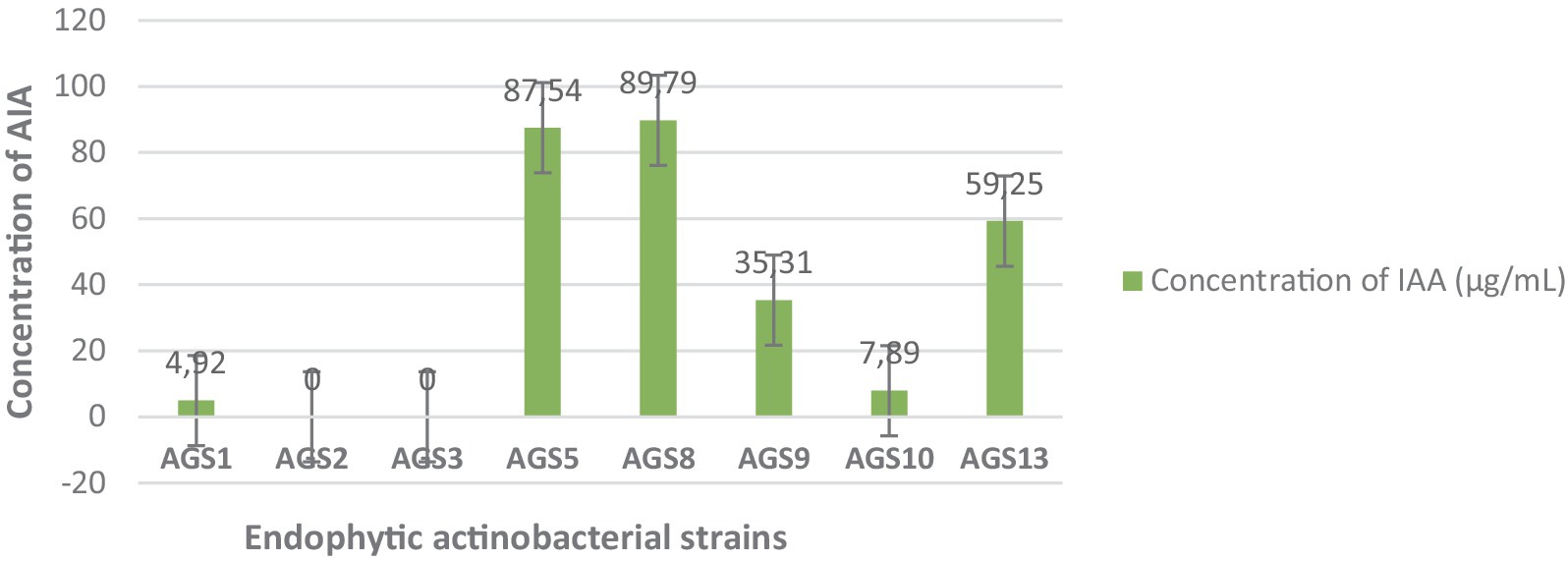 Figure 7. Quantitative estimation of Indole-3-Acetic Acid (IAA) production by the endophytic isolates. Error bars represent the standard deviations of the means from two independent replicates.