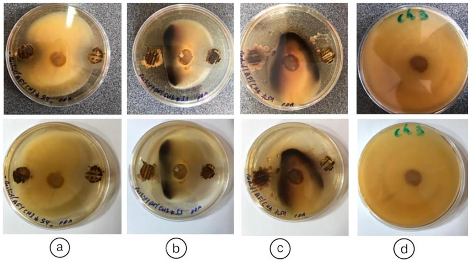 Figure 8. Antifungal activity of endophytic actinobacteria isolates (AGS5, AGS8, and AGS10) obtained from Anacyclus pyrethrum, showing growth inhibition of pathogenic fungi. (a) AGS5 (By5a); (b) AGS8 (By8); (c) AGS10 (By10); (d) untreated control.