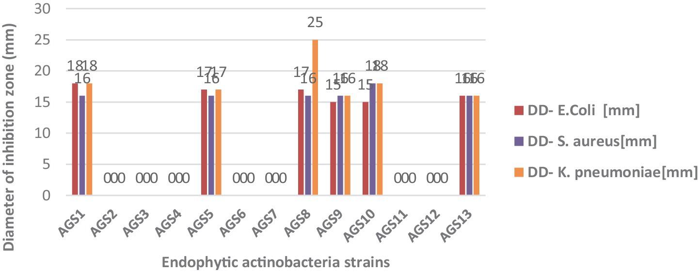 Out of the actinobacterial strains tested, 6 strains (AGS1, AGS5, AGS8, AGS9, AGS10, and AGS13) demonstrated activity against Gram-positive bacteria (Staphylococcus aureus), representing 33.33% of the strains. The remaining strains (AGS1, AGS5, AGS8, AGS9, AGS10, and AGS13), accounting for 66.66%, showed activity against Gram-negative bacteria (E. coli and Klebsiella pneumoniae). Both Staphylococcus aureus, Escherichia coli, and Klebsiella pneumoniae were found to be sensitive to Anacyclus pyrethrum macerate at a concentration of 100 μg/mL (Figure 9).