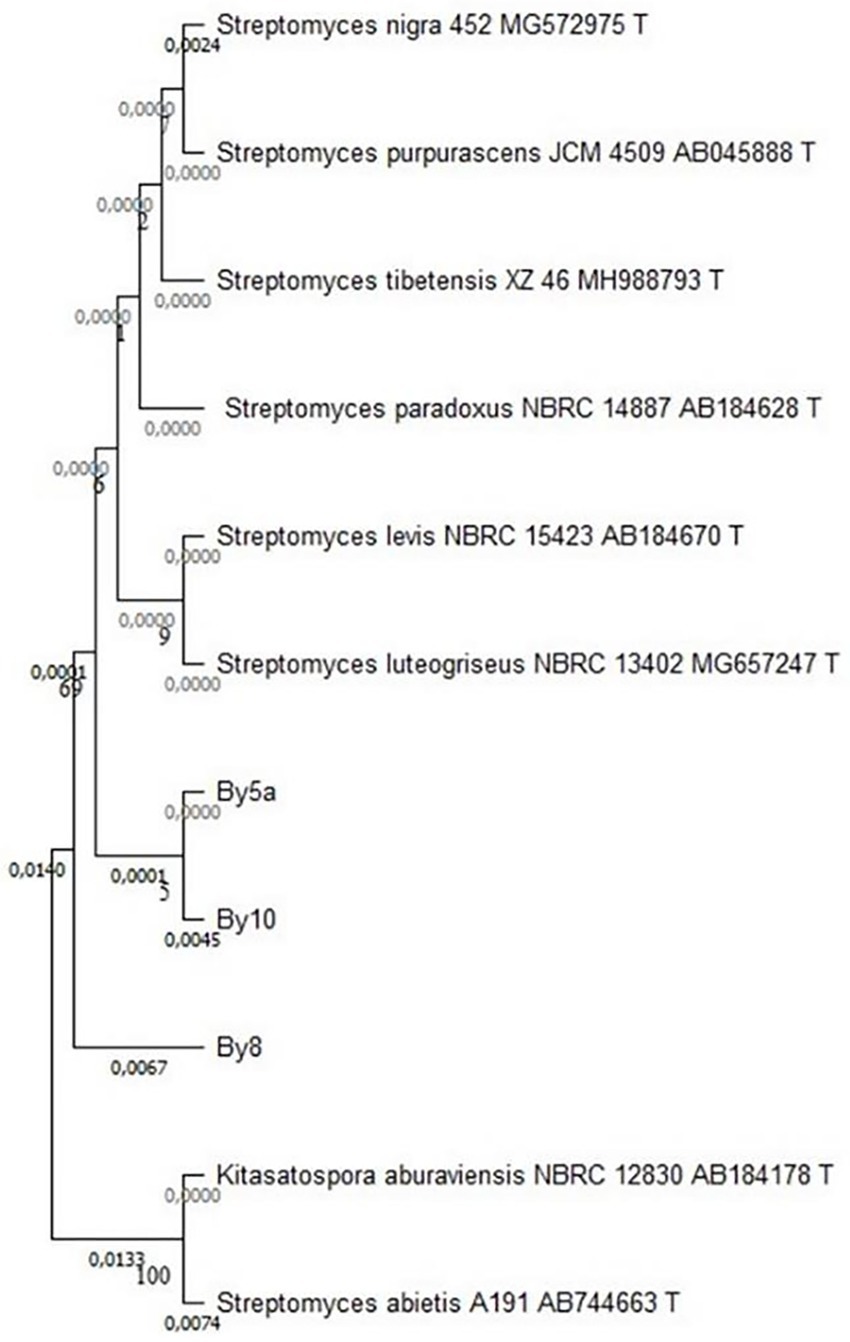 Sequence analysis revealed that isolates By5a and By10 were nearly identical, exhibiting an extremely low genetic distance (0.0001) and an estimated sequence similarity of approximately 99.99%. In contrast, isolate By8 showed a slightly lower similarity to By10 (99.55%) with a corresponding genetic distance of 0.0045, suggesting a modest level of intra-group variation. Phylogenetic comparisons with type strains indicated that the three isolates (By5a, By10, and By8) were most closely related to Streptomyces luteogriseus (99.33% similarity, genetic distance of 0.0067), while more distantly related to S. levis (99.01%, distance 0.0099) and S. paradoxus (99.00%, distance 0.0100) (Table 1).
