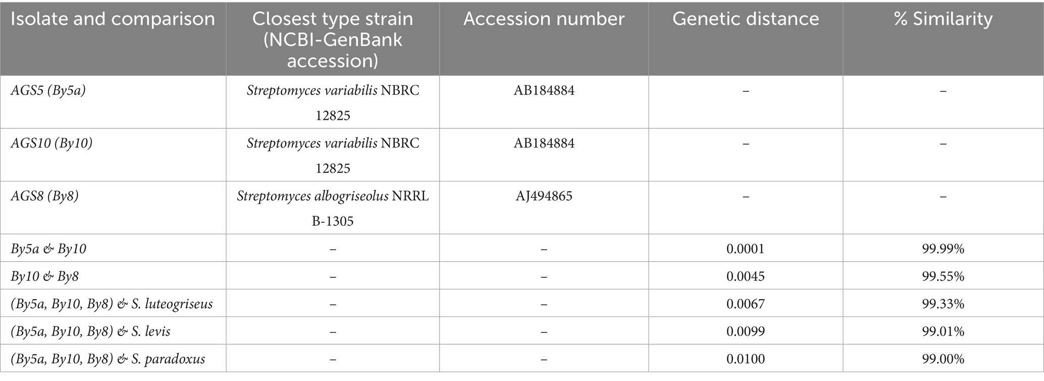 The 16S rRNA gene analysis of the three root-associated Streptomyces isolates (AGS5/By5a, AGS10/By10, and AGS8/By8) demonstrated a high level of genetic relatedness, with By5a and By10 sharing almost identical sequences (99.99%), while By8 displayed a slightly lower similarity (99.55% with By10). The analysis reveals that the isolates belong to a closely related phylogenetic cluster within the genus Streptomyces. Nevertheless, it is well established that 16S rRNA gene sequencing alone does not provide sufficient resolution for reliable species-level identification in Streptomyces. Thus, while 16S rRNA analysis remains useful for preliminary classification and phylogenetic inference, its limitations highlight the need for complementary genomic and phenotypic approaches to ensure precise taxonomic assignment. The high sequence similarity among the three isolates reinforces their close evolutionary affiliation, yet comprehensive analyses integrating multilocus sequence data and genomic comparisons are essential for accurately delineating diversity within this complex genus (Ranjan et al., 2023).