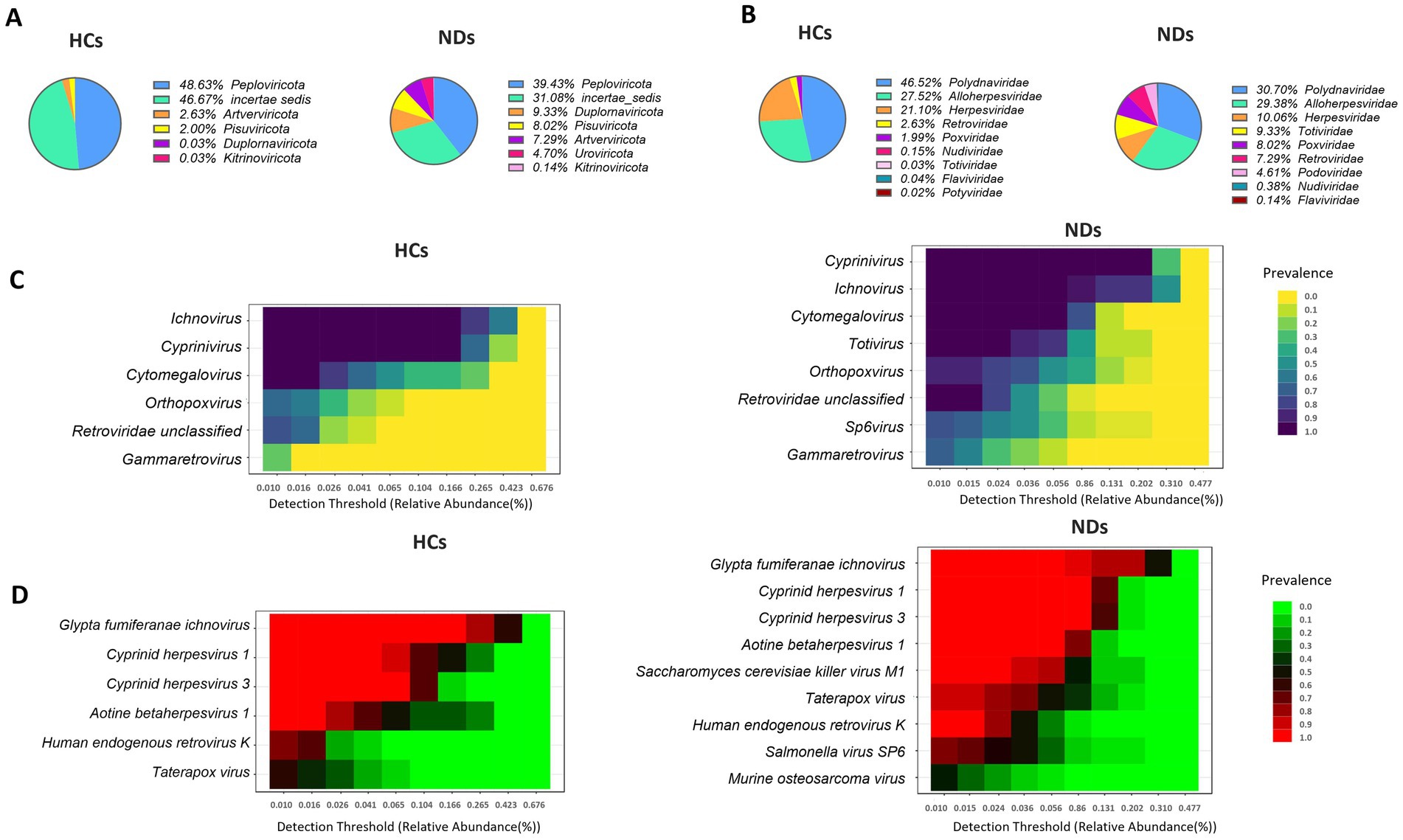 Four panels illustrate viral composition and prevalence data. Panels A and B present pie charts comparing the relative abundances of various viral taxa in healthy controls (HCs) and neurodegenerative disease (ND) groups. Panels C and D display heat maps of virus prevalence against detection thresholds for HCs and NDs, respectively, with varying colors indicating prevalence levels.