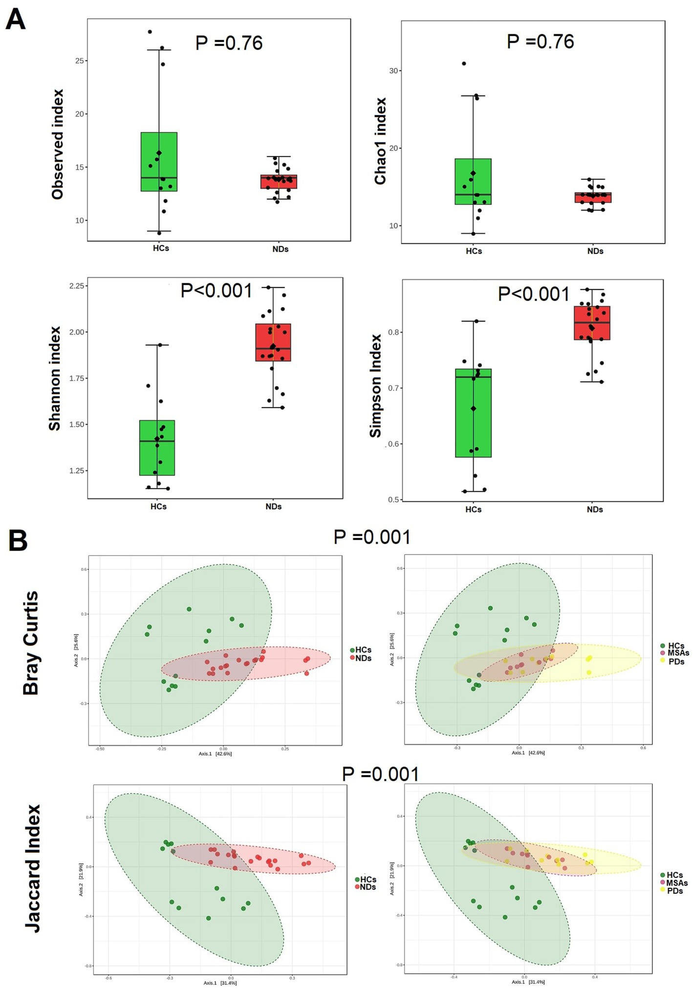 Two panels illustrating data comparisons. Panel A shows box plots of Observed, Chao1, Shannon, and Simpson indices comparing two groups, HCs and NDs, with significance values. Panel B displays Bray-Curtis and Jaccard index scatter plots with ellipses highlighting group differences among HCs, NDs, MSAs, and PDs, also with significance values.