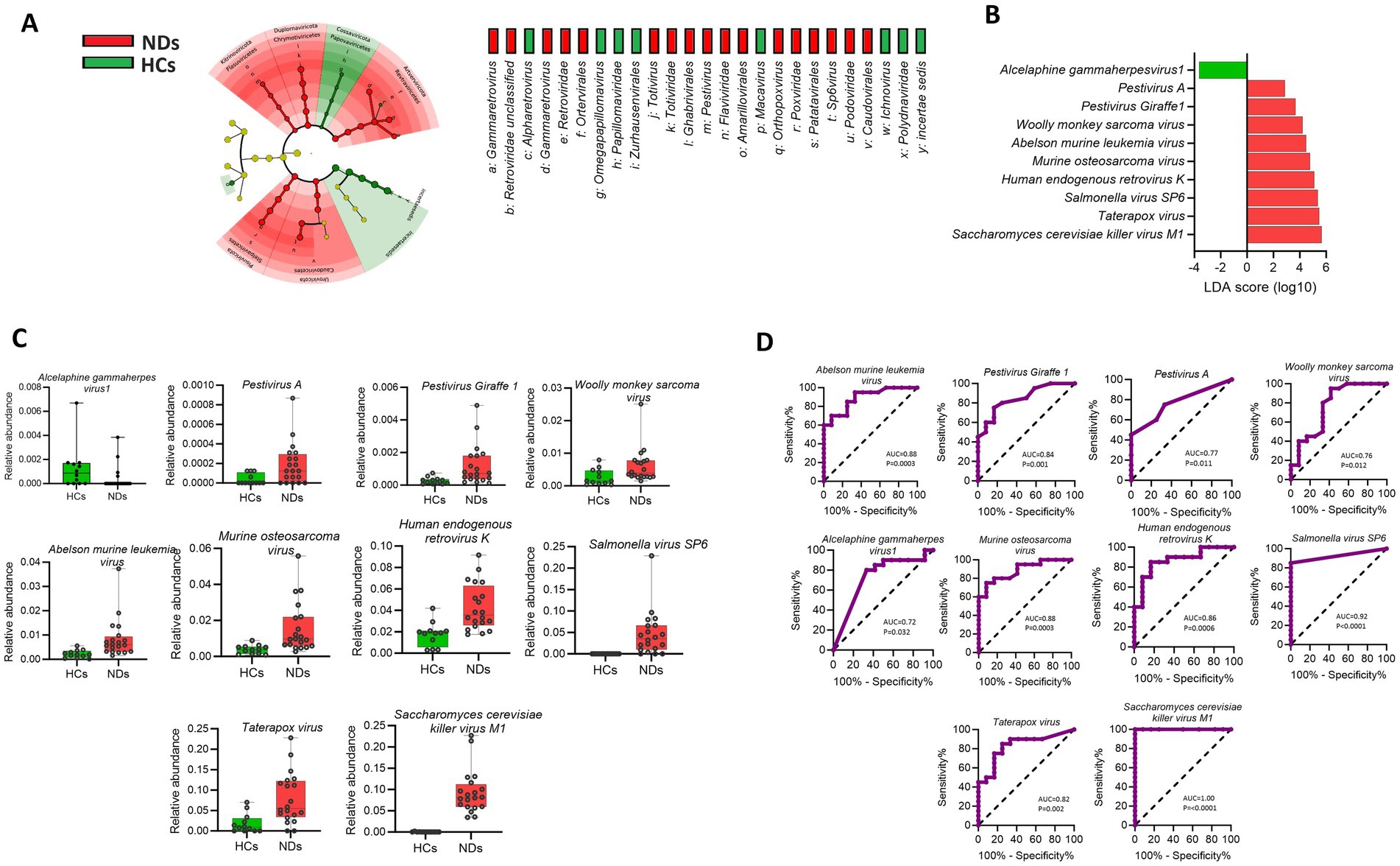 Figure 3. Brain viral signatures are significantly different between HCs and NDs (A) Cladogram of the LEfSe analysis of the brain virome, with taxa enriched in HCs in green and those enriched in NDs in red. (B) Linear discriminant analysis (LDA) effect size analysis (LEfSe) identified the most differentially abundant viral species between HCs and NDs (p < 0.05; LDA score 2). HCs-associated viral species are indicated with negative LDA scores (green) while NDs-associated viral species are indicated with positive LDA scores (red color). (C) Mann–Whitney test for each of the identified viral signature displayed (p < 0.05). (D) Receiver operating characteristics (ROC) analysis showed that the area under curves (AUC) values of the individual viral signature differ between HCs and NDs (AUC; 95% CI).