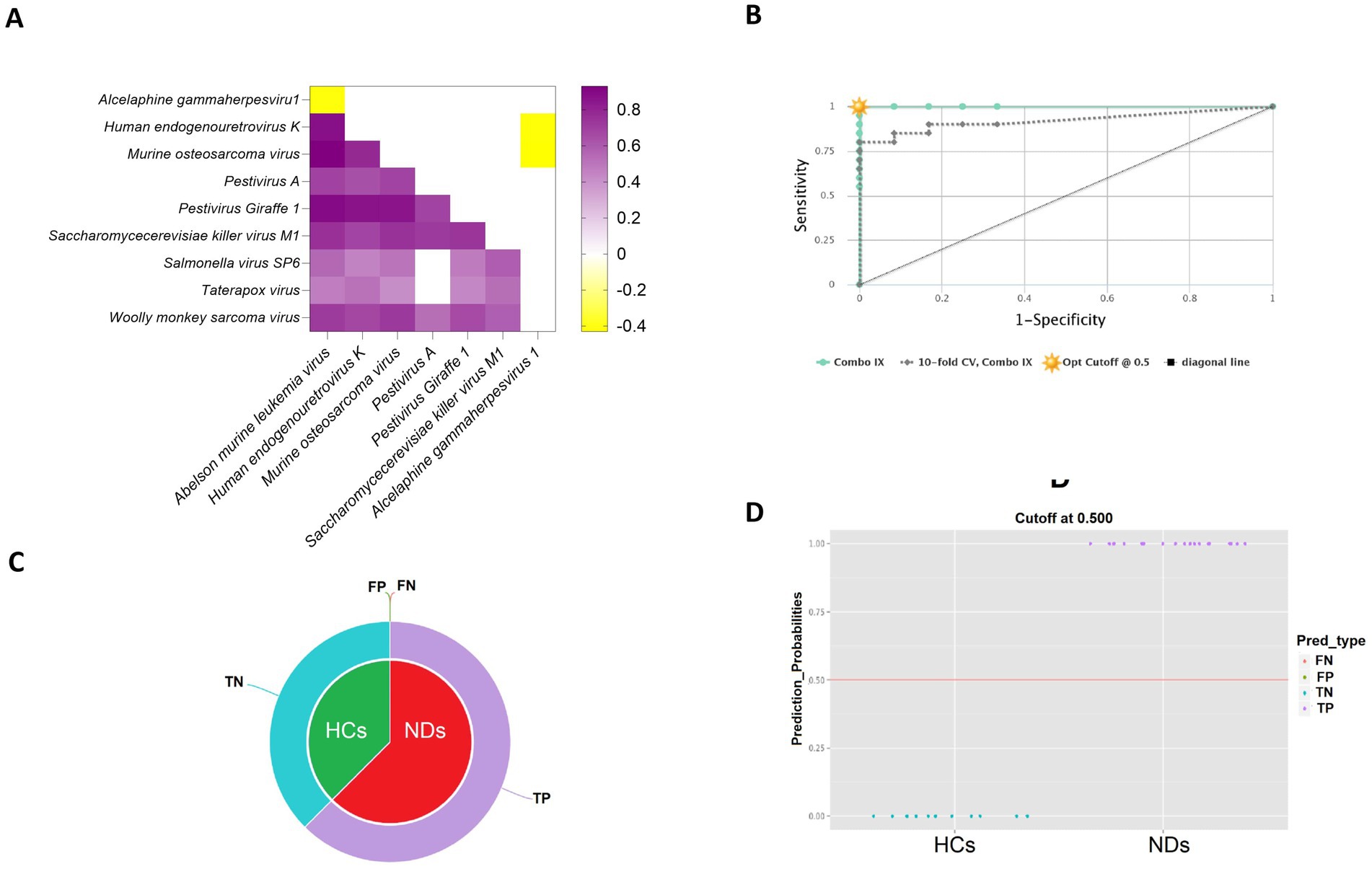 Figure 4. Evaluation of the predictive power of viral signatures identified between healthy controls (HCs) and neurodegenerative disorders (NDs). (A) The heatmap represents the co-occurrence of viral signatures identified by Spearman correlation analysis. (B) The CombiROC curve combines multiple biomarkers and displays their discriminatory power between the two compared classes. (C) The pie charts illustrate the fraction of predictions, including false negatives (FN), false positives (FP), true negatives (TN), and true positives (TP), providing an overall assessment of the predictive performance of the model. (D) The violin plot depicts the data’s probability density for HCs and NDs based on the previously determined optimal cut-off on the corresponding ROC curve.