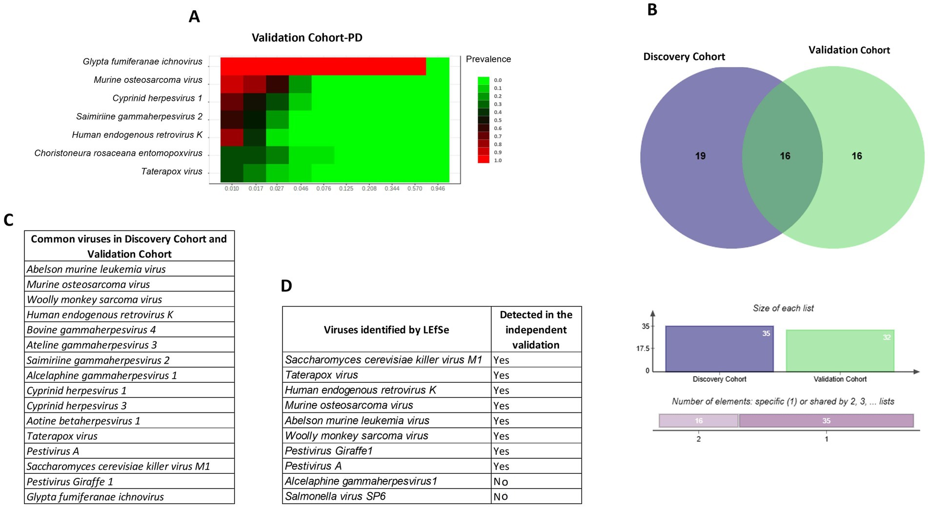 Panel A shows a heatmap of virus prevalence in the validation cohort, ranging from 0 to 1. Panel B displays a Venn diagram comparing discovery and validation cohorts, overlapping at 16 viruses. Panel C lists common viruses found in both cohorts, including Murine osteosarcoma virus and Human endogenous retrovirus K. Panel D lists viruses identified by LEfSe, specifying those detected in independent validation.