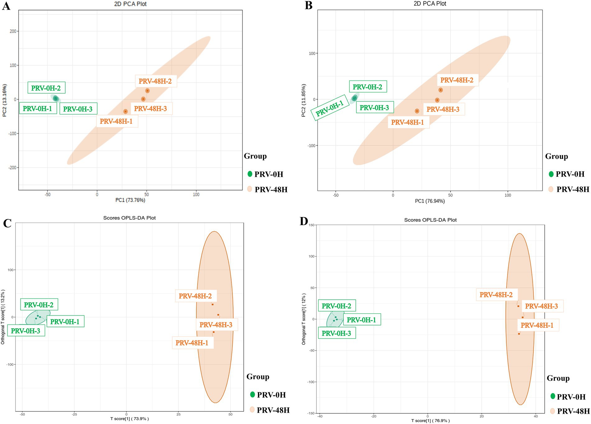 Figure 1. Multivariate statistical analysis of the metabolic profiles. PCA score plots of metabolic profiles from PRV-infected PK-15 cells (48 h post-infection, PRV-48H) and mock-infected controls (0 hpi, PRV-0H) in positive (ESI+, A) and negative (ESI−, B) ionization modes. Each point represents an independent biological replicate (n = 3). The percentage of variance explained by each principal component (PC) is indicated on the axes. (C,D) Orthogonal projections to latent structures-discriminant analysis (OPLS-DA) score plots derived from the same datasets in ESI+ (C) and ESI− (D) modes. The model quality parameters are displayed.