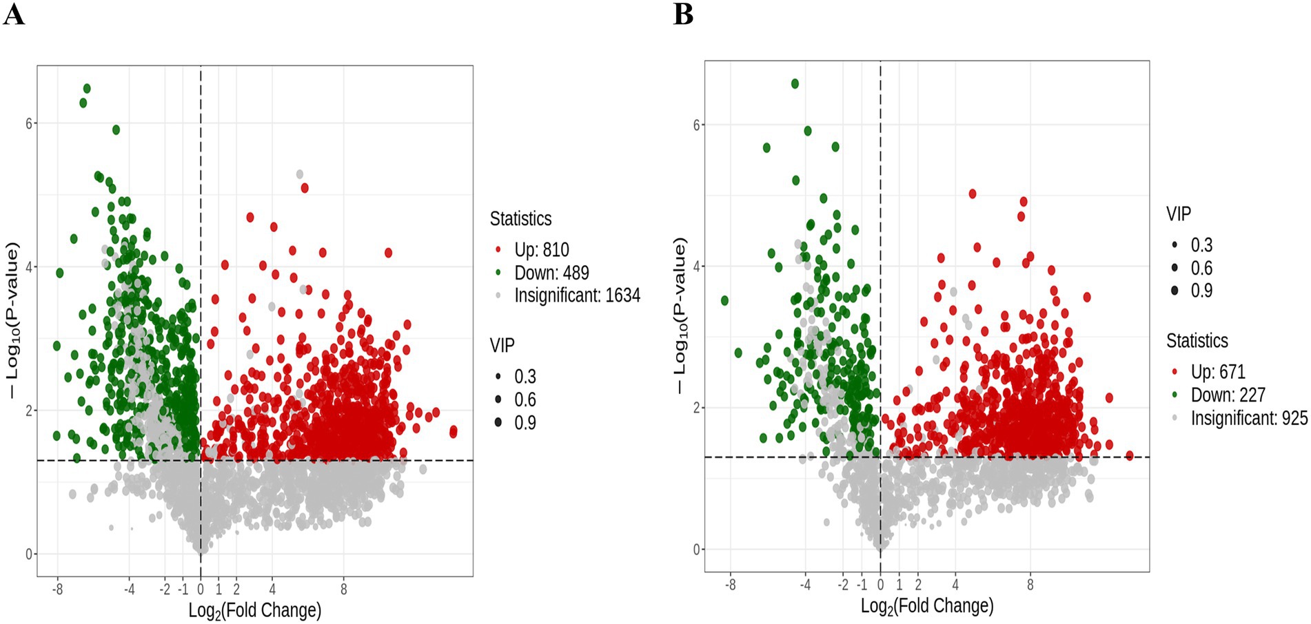 Figure 2. The differentially expressed metabolites in Volcano plot. The volcano plots depict all significantly altered metabolites (VIP > 1, p < 0.05) under the ESI+ (A) and ESI− (B). Each dot in the volcano plots represents an individual metabolite: green dots denote downregulated differential metabolites, red dots represent upregulated differential metabolites, and gray dots represent detected metabolites with no significant differences. The x-axis indicates the logarithm of the fold change in the relative content of a specific metabolite between the two sample groups, while the y-axis represents the level of statistical significance.