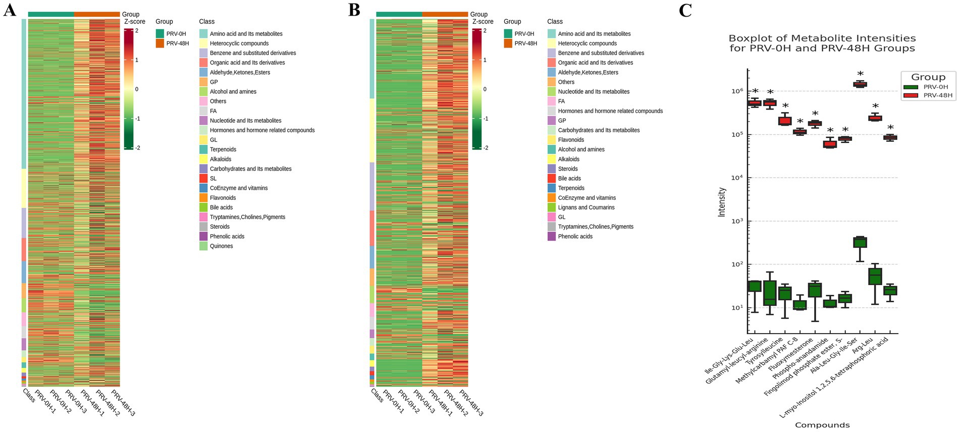 Figure 3. Analysis of differentially expressed metabolites. Heatmaps displaying the relative abundance (Z-score normalized) of all significantly altered metabolitesin ESI+ (A) and ESI− (B) modes. Rows represent metabolites, and columns represent biological replicates (n = 3 per group). (C) Box plots showing the normalized intensity distributions of 10 representative differentially abundant metabolites. Data are presented for each replicate in the PRV-0H and PRV-48H groups. Statistical significance was determined by Student’s t-test (*p < 0.05).
