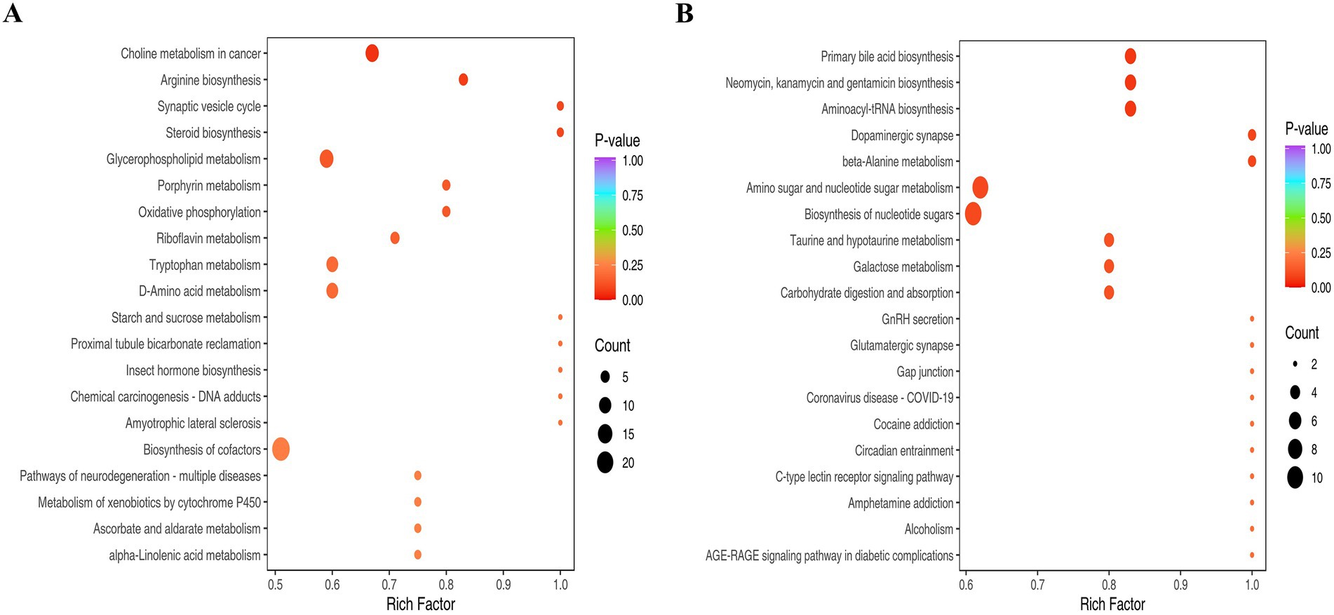 Figure 4. The KEGG analysis. (A) Pathways enriched for metabolites detected in ESI+. (B) Pathways enriched for metabolites detected in ESI−. The abscissa represents the Rich Factor corresponding to each pathway, and the ordinate is the pathway name (sorted by p-value). The color of the dots indicates the p-value, with redder dots representing more significant enrichment. The size of the dots represents the number of differential metabolites enriched.