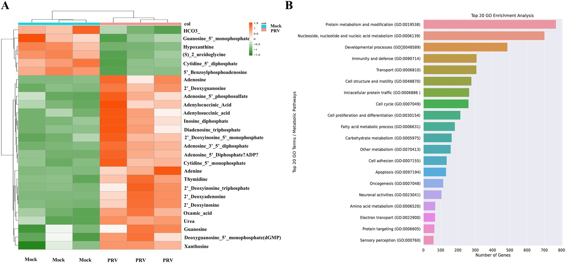 In the OPLS-DA model, the VIP metric served to evaluate the contribution and explanatory power of each metabolite in distinguishing sample categories among different taxonomic groups, thereby facilitating the identification of biologically relevant differential metabolites. Significant differential metabolites were selected based on a VIP threshold greater than 1.0, combined with a statistical significance level of p < 0.05. A total of 2,197 metabolites were significantly altered upon PRV infection. The distribution of these metabolites was as follows: 810 increased and 489 decreased in the ESI+ mode (Figure 2A), and 671 increased and 227 decreased in the ES− mode (Figure 2B).