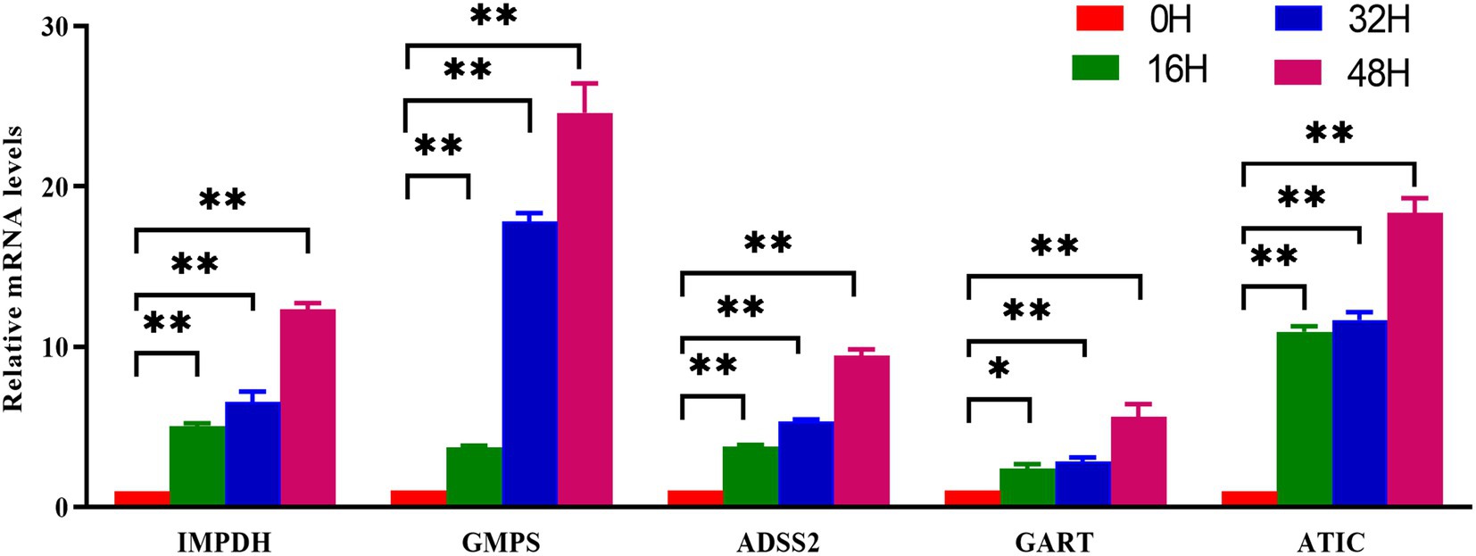 Figure 6. Validation of nucleotide metabolism related genes by qPCR. PK-15 cells were infected with PRV (RA strain, MOI = 1) or mock-infected and collected at the indicated time points. Total RNA was extracted and reverse-transcribed, followed by qRT-PCR analysis with gene-specific primers. Expression levels of purine biosynthesis genes (IMPDH, GMPS, ADSS2, GART, ATIC) were normalized to GAPDH and calculated using the 2^(–ΔΔCt) method relative to the 0 hpi control. Data are presented as mean ± S.D. from three independent biological replicates (n = 3). *p < 0.05, **p < 0.01.