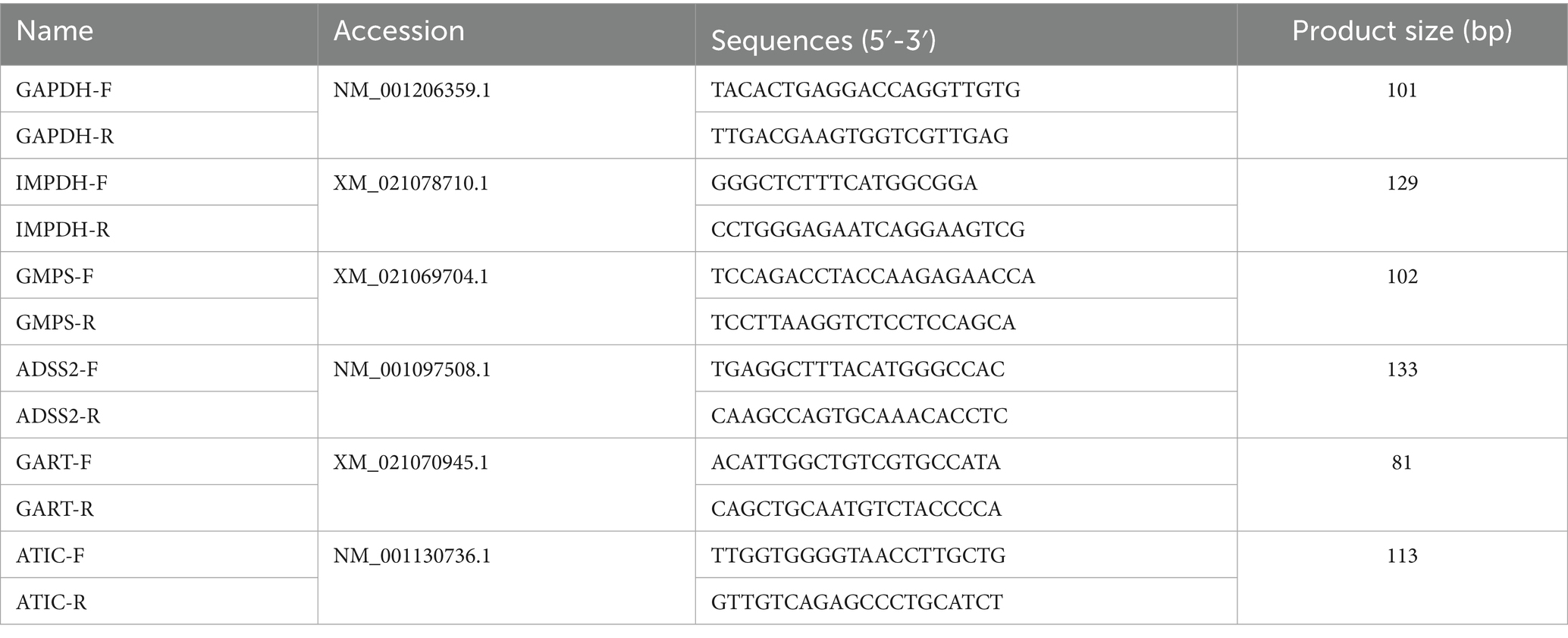 A growing body of evidence has shown that multiple viruses are capable of manipulating host components and signal pathways to boost viral replication by reprogramming host metabolism. For instance, Newcastle disease virus (NDV) regulates the metabolism of host cells by degrading sirtuin 3 (SIRT3) via PTEN-induced kinase 1 (PINK1)- Parkin (PRKN)-dependent mitophagy (Gong et al., 2022). By promoting the uptake of glucose and glutamine by cells, porcine reproductive and respiratory syndrome virus (PRRSV) infection supplies the energy and macromolecules required for self-replication. In addition, PRRSV effective replication in cells depends on glycolysis and the tricarboxylic acid (TCA) cycle (Pang et al., 2023). Porcine epidemic diarrhea virus (PEDV) infection suppressed transcription of lipid metabolism-related genes, and treatment of the infected enteroids by palmitic acid led to pronouncedly reduction of PEDV replication. These findings suggest that PEDV may take advantage of the host lipid metabolism for its own replication (Mao et al., 2022). In our recent study, we found that PRV infection disrupted the succinylation of cellular enzymes that are critical to metabolic processes (Chen et al., 2023). However, despite these advances, the role of nucleotide metabolism—a pathway fundamental to viral DNA replication—remains incompletely characterized in the context of PRV infection. Nucleotides are the building blocks of viral genomes, and their de novo synthesis or salvage by host cells is often a rate-limiting step for viral replication. Herpesviruses, in particular, are known to upregulate nucleotide metabolic pathways to support their replicative cycle, yet the specific mechanisms by which PRV modulates these pathways, and their significance for viral fitness, remain to be defined.