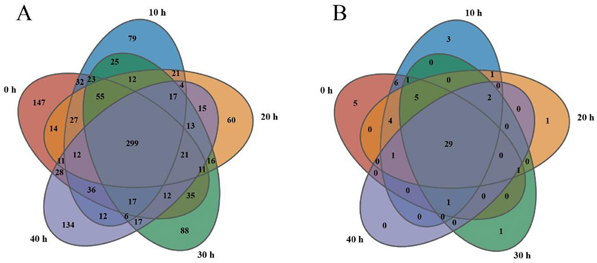 As shown in Figure 2A, the bacterial OTUs of the samples accumulated at 0 h, 10 h, 20 h, 30 h, and 40 h were 780, 677, 608, 667, and 642, respectively. The total number of common OTUs was 299, and the OTUs specific to the samples in the five time periods were 147, 79, 60, 88, and 134, respectively. As shown in Figure 2B, the fungal OTUs of the samples accumulated at 0–40 h were 53, 53, 44, 40, and 34, respectively. The total number of common OTUs was 29, and the OTUs specific to the samples in the five time periods were 5, 3, 1, 1, and 0, respectively. The results show that the number of bacterial OTUs in the 0 h sample was the highest at 780, while the number of fungal OTUs in the 0 h and 10 h samples was the highest at 53. This is similar to the analysis results in Table 1. During the accumulation process, the number of OTUs of bacteria and fungi differed the least at 10 h and 30 h, and the greatest difference occurred at 0 h and 20 h.