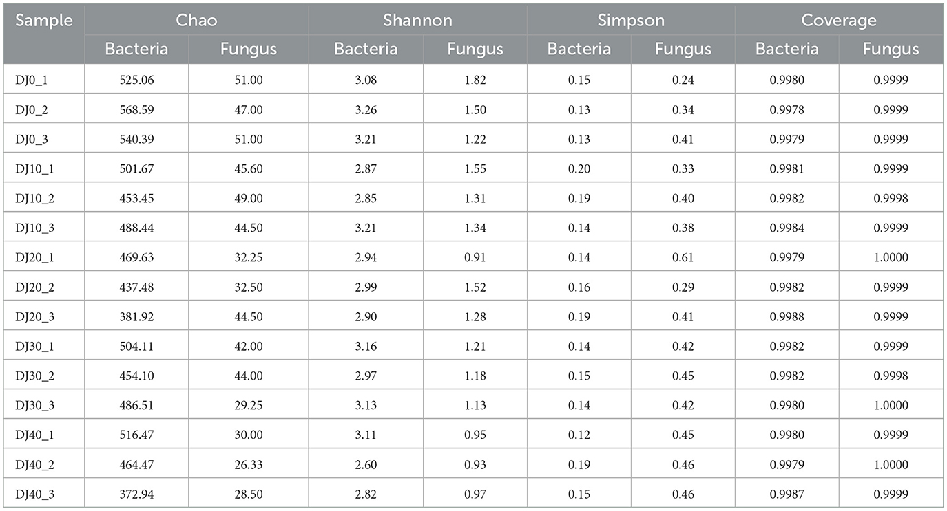 The diversity analysis of Alpha is usually employed to analyze the diversity of microbial communities in samples. The diversity analysis of a single sample, Alpha, can reflect the species abundance and diversity of microbial communities within the sample (Tian et al., 2020). As shown in Table 1, the sequencing coverage rates of both bacteria and fungi are above 0.99, indicating that the sequencing depth is sufficient and almost all samples in the samples have been detected. The sequencing results can truly reflect the diversity composition of bacterial and fungal communities in the fermented grains samples. As shown in Table 1, for bacteria, the Chao1 index decreased from 0 to 30 h, then gradually increased and decreased again from 30 to 40 h, and reached the highest value at 0 h of the piling up fermentation and the lowest value at 20 h of the piling up fermentation; for fungi, the Chao1 index kept decreasing. The Shannon index and Simpson index of bacteria remained basically unchanged; the Shannon index of fungi decreased slowly while the Simpson index remained basically unchanged. Overall, the richness and diversity of fungi were relatively high at the early stage of the accumulation of the fermented grains, and the richness of bacteria was generally higher than that of fungi.