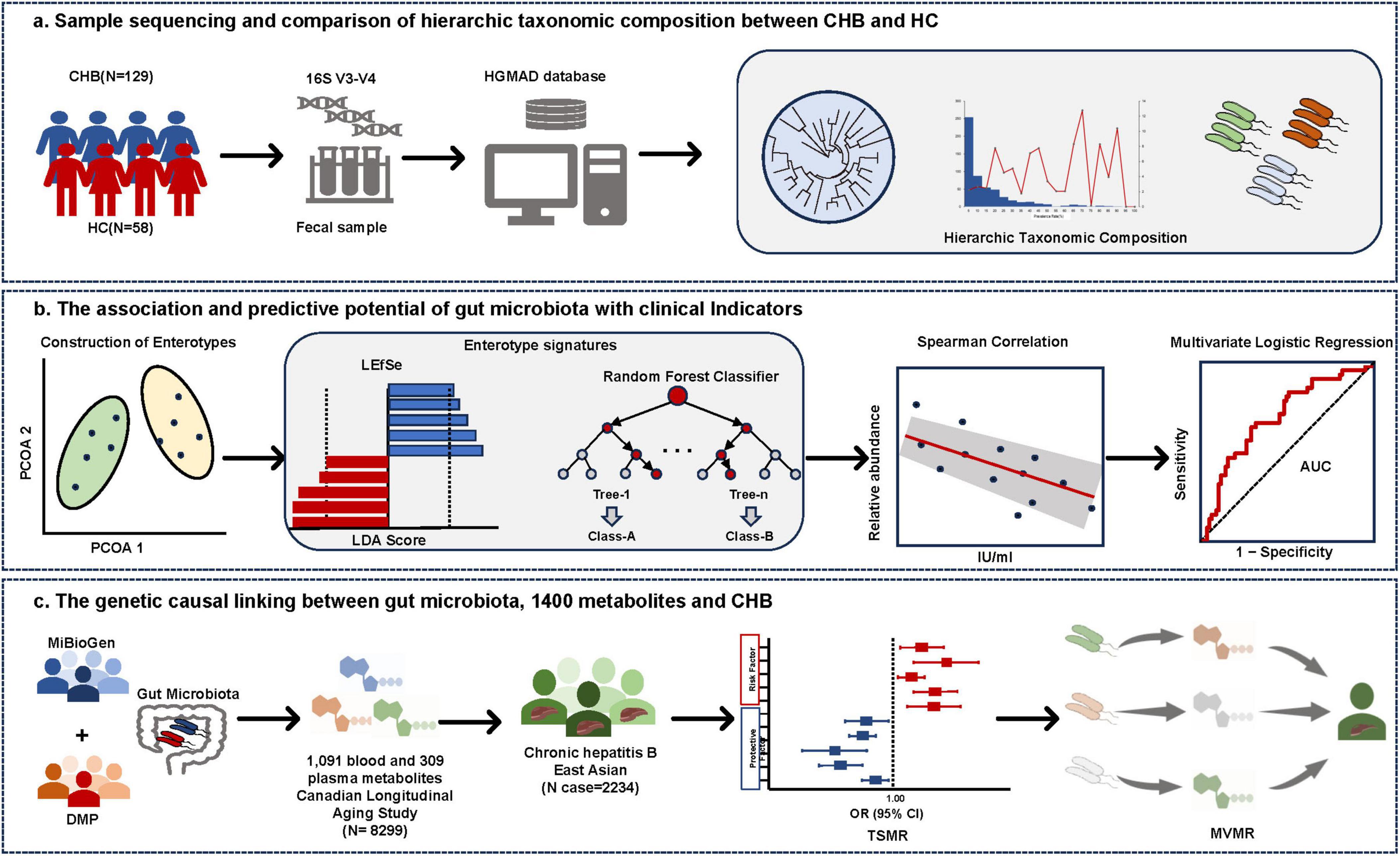Diagram illustrating research on gut microbiota in chronic hepatitis B (CHB). Panel a shows sample sequencing and taxonomic composition analysis between CHB and healthy controls using fecal samples, 16S sequencing, and taxonomic databases. Panel b depicts analysis of gut microbiota’s association with clinical indicators using enterotypes, random forest classifiers, and logistic regression. Panel c examines genetic links between gut microbiota, metabolites, and CHB using data from the MiBioGen and Canadian longitudinal study, highlighting causal relationships through multivariable Mendelian randomization.
