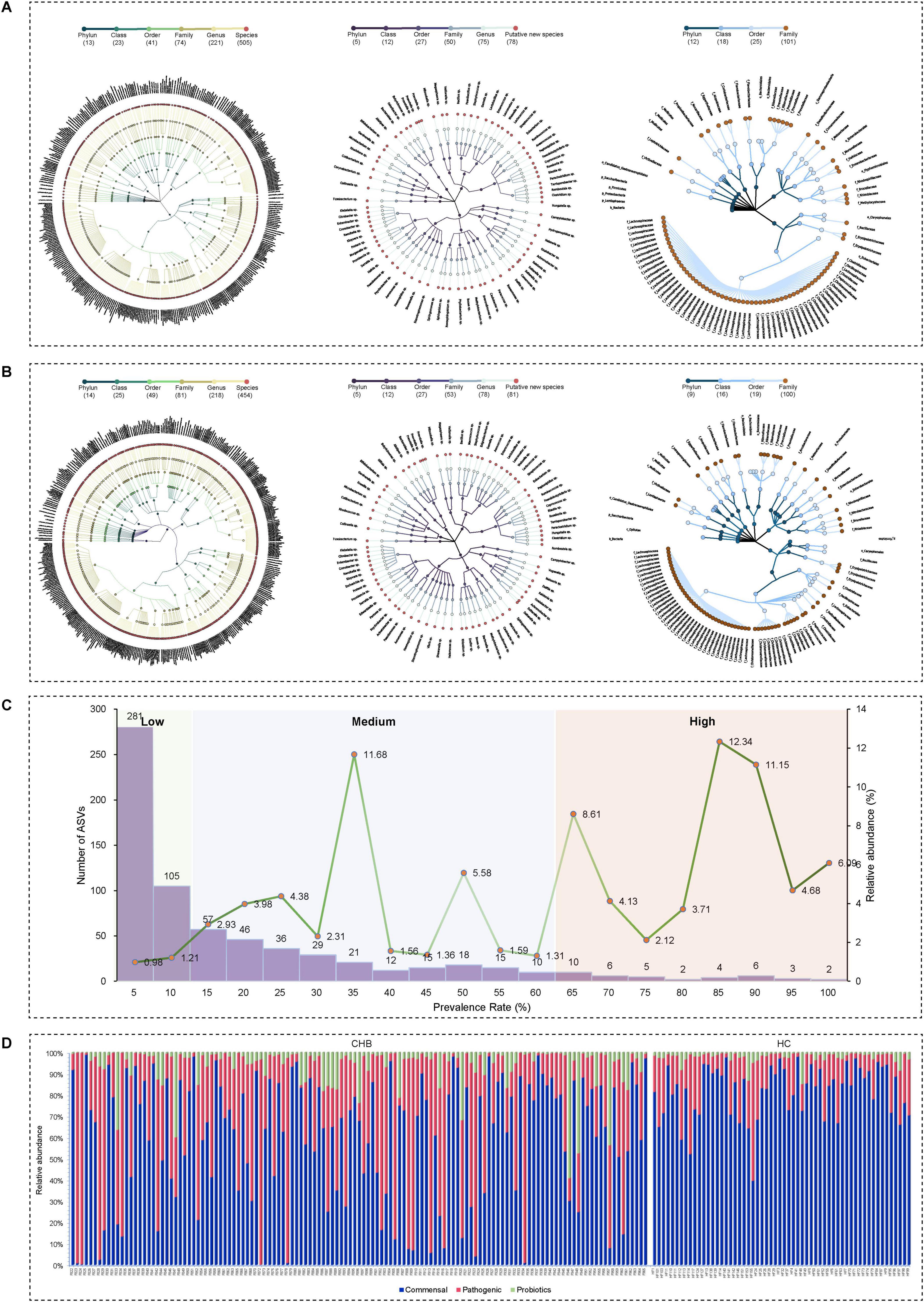 Figure 2. Taxonomic profiles of the gut microbial community in CHB patients and HC. (A) Taxonomic tree of CHB patients. (B) Taxonomic tree of HC. (C) Low-, medium-, and high-prevalence bacterial groups in CHB patients, showing the numbers (left axis) and relative abundance (right axis) of ASVs. (D) Relative abundance of probiotic, commensal, and potential pathogenic bacteria in CHB patients and HC.