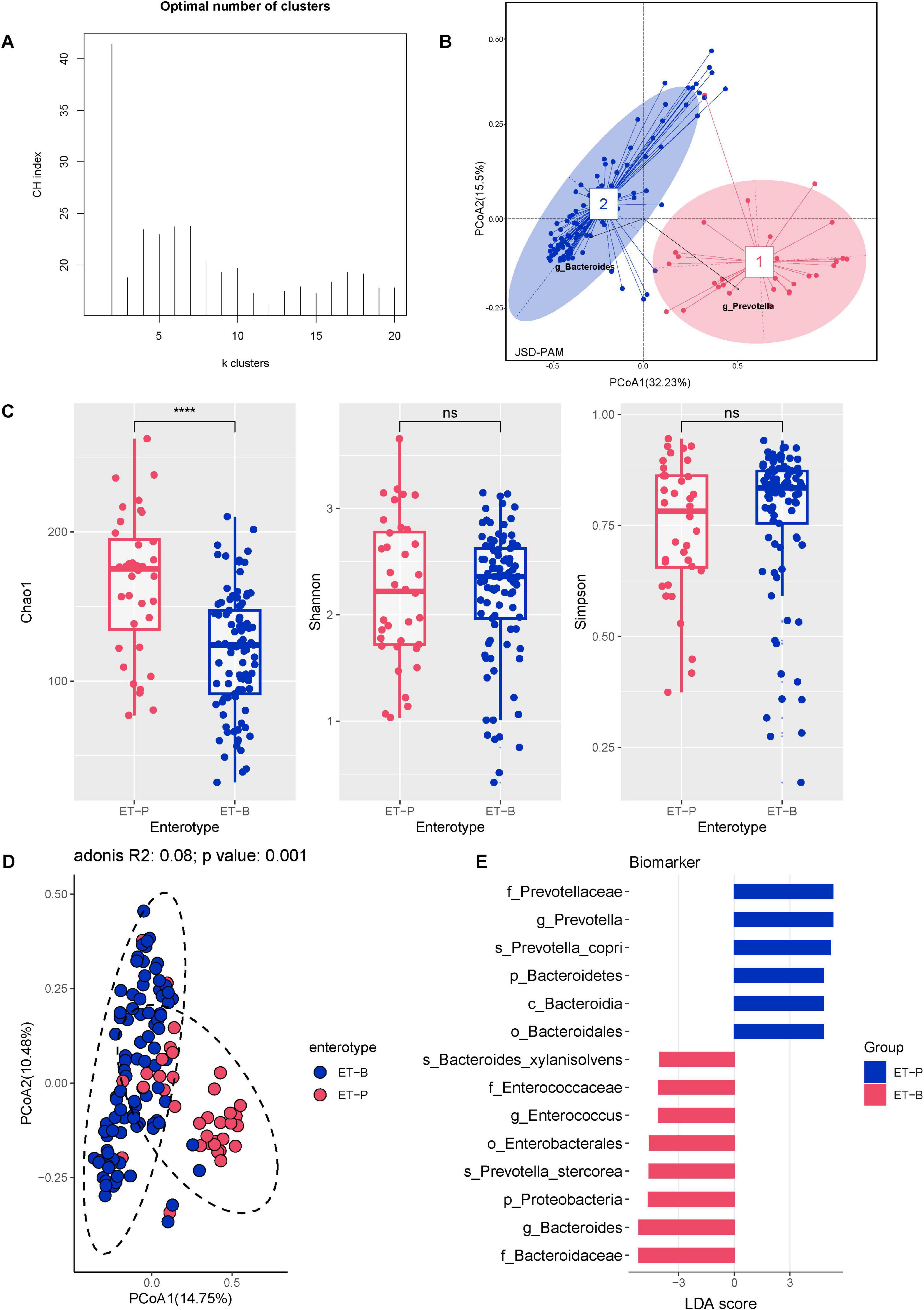 Composite image showing data visualizations. A: Bar graph illustrating CH index across different k clusters, peaking at two. B: Scatter plot with two ellipses, red for Prevotella and blue for Bacteroides clusters, with arrows indicating sample distributions on PCoA axes. C: Three box plots comparing Chao1, Shannon, and Simpson indices between ET-P and ET-B enterotypes, indicating significant or nonsignificant differences. D: Scatter plot showing distribution of ET-B and ET-P enterotypes with distinct group clustering. E: Bar graph displaying LDA scores for biomarkers, differentiating between blue ET-B and red ET-P groups.