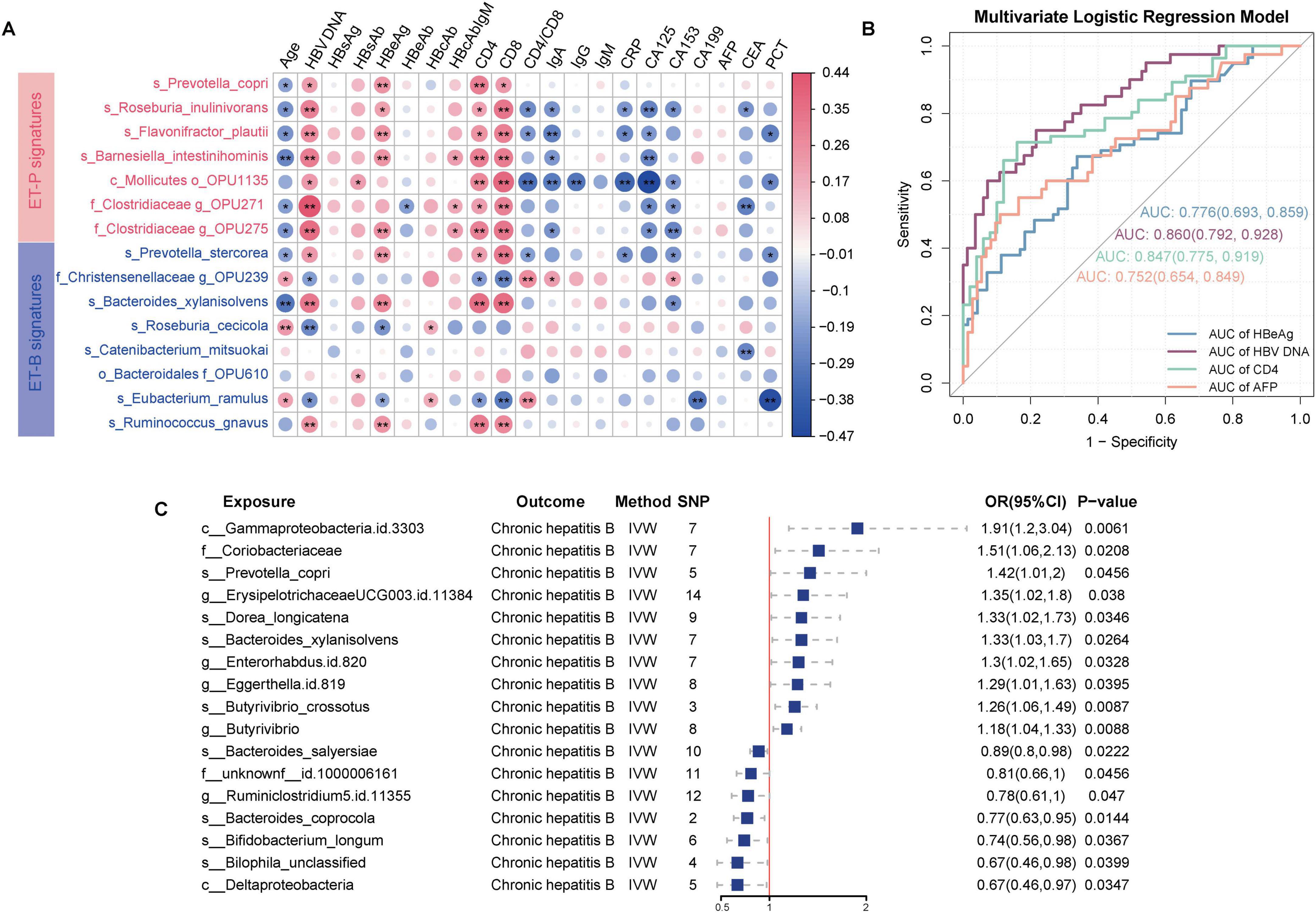Figure 4. Predictive capability of enterosignatures for clinical indicators and causal relationships between gut microbiota and CHB. (A) Correlation heatmap between enterosignatures and clinical indicators. Valid associations were filtered at P < 0.05 after Benjamini–Hochberg correction. Significance codes: *P < 0.05; **P < 0.01. (B) ROC curves of multivariate logistic regression models predicting clinical phenotypes (HBeAg, HBV DNA, CD4+T-cell count, AFP) in CHB patients. HBeAg was grouped into HBeAg-positive and HBeAg-negative. HBV DNA levels were stratified at a threshold of 104 IU/mL. CD4+T-cell count were grouped into high and low immune states using a cutoff of 500 cells/μL. AFP was categorized into positive (>9 ng/mL) and negative (≤9 ng/mL) groups. (C) Forest plot illustrating significant causal associations between gut microbiota and CHB using the inverse variance weighted method, with P < 0.05.