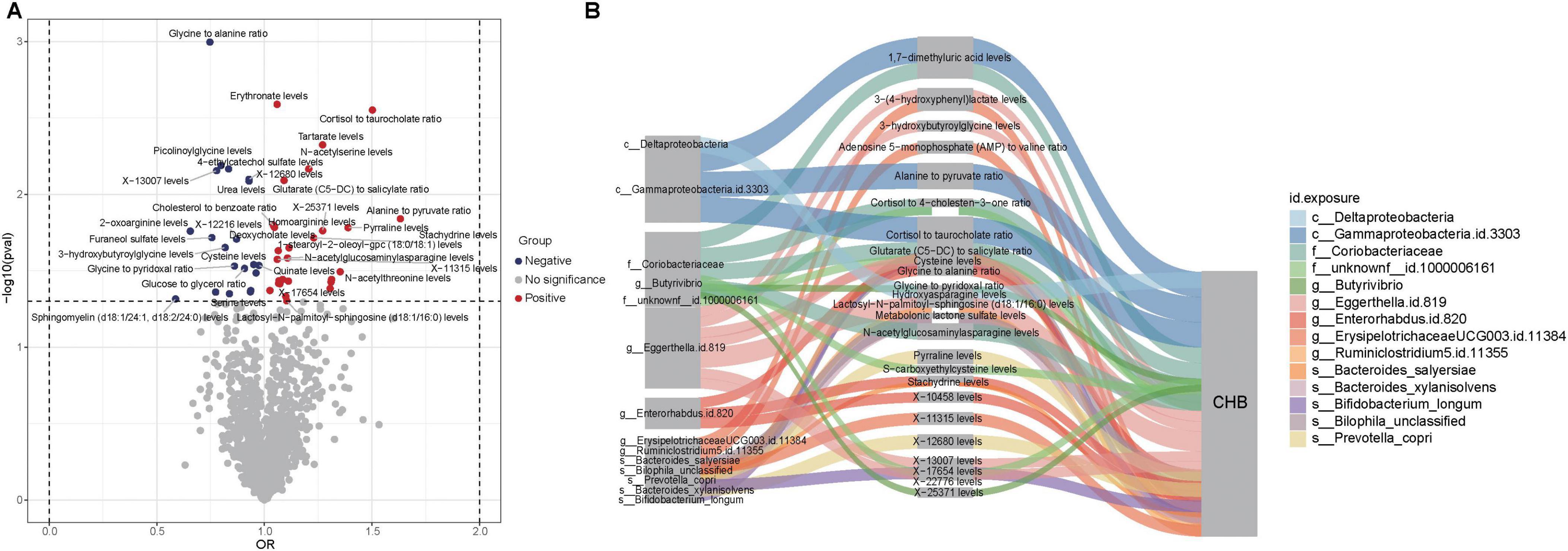 Figure 5. Causal relationships and potential mechanisms linking gut microbiota, metabolites, and CHB. (A) Volcano plot showing causal relationships between metabolites and CHB. Red dots represent metabolites with positive associations, while blue dots indicate metabolites with negative associations. (B) Sankey diagram illustrating potential mechanisms of interaction among gut microbiota, metabolites, and CHB.