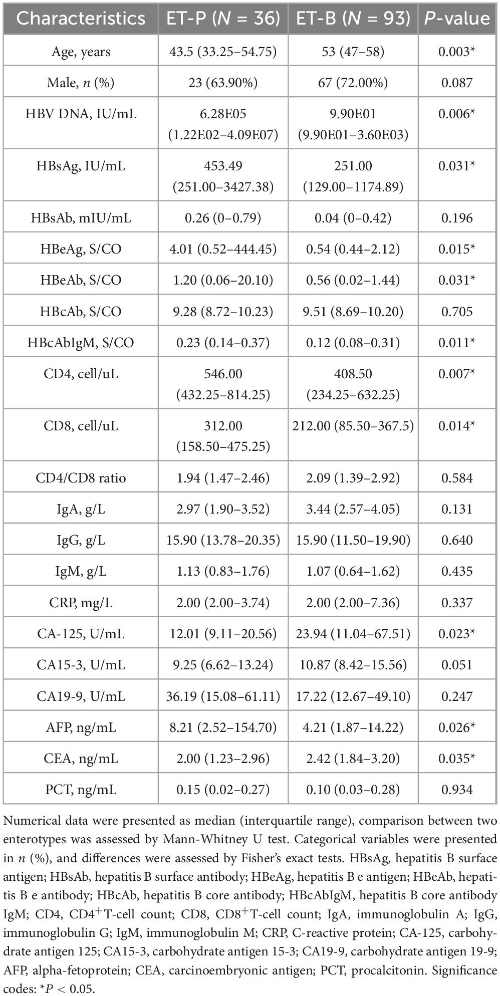 Comparison of clinical indicators between the two enterotypes in CHB patients revealed that ET-P exhibited significantly elevated levels of HBV DNA, HBsAg, and HBeAg. Furthermore, ET-P demonstrated significantly higher CD4+T-cell count, CD8+T-cell count, and alpha-fetoprotein (AFP) levels. Conversely, cancer antigen 125 (CA125) and carcinoembryonic antigen (CEA) levels were elevated in ET-B (Table 1).