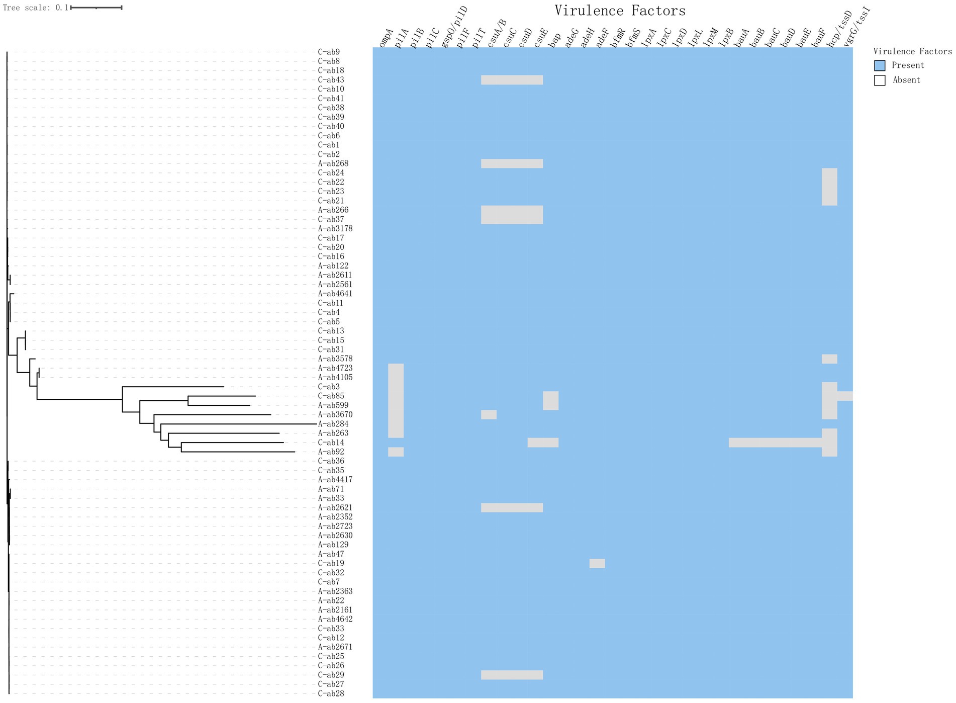 Using Parsnp (v1.2) to construct the core genome single-nucleotide polymorphism (SNP) phylogenetic tree of the strains. Among them, strains A-ab24, A-ab2530, A-ab255, A-ab3322, A-ab3592, A-ab4388, and C-ab34 are genetically distant from the other 70 strains and were not included in the construction of the core genome SNP phylogenetic tree. The tree was visualized and annotated using the Interactive Tree of Life (iTOL) platform.
