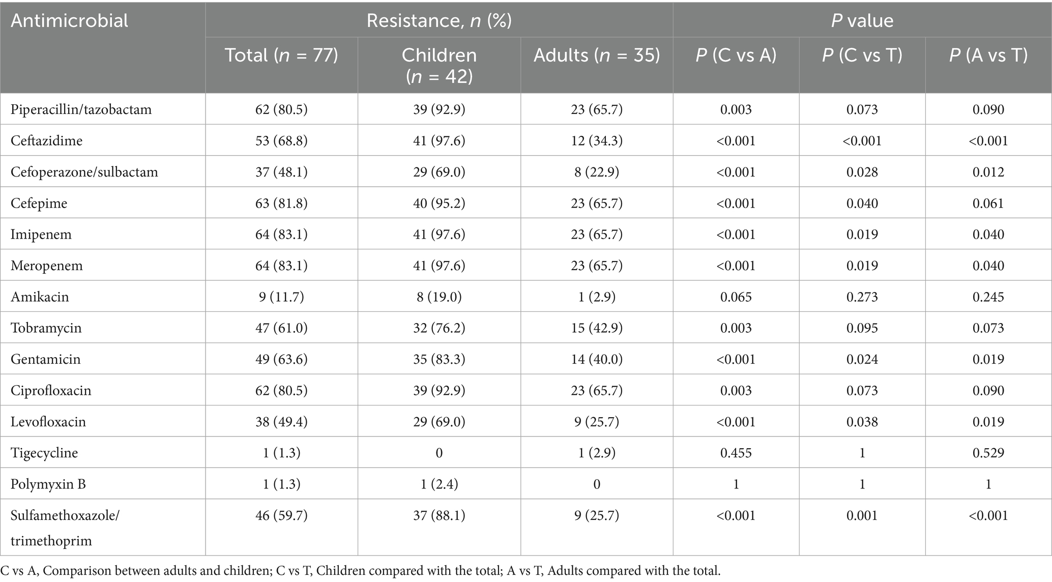 A classification and univariate analysis was performed on 77 A. baumannii strains identified from blood samples, including 35 from adults and 42 from pediatric patients. Among the pediatric isolates, 37 (88.1%) originated from the Pediatric Intensive Care Unit (PICU), while the remaining 4 were from the cardiothoracic and oncology departments (Table 1). Previous studies have reported that primary diseases, immunodeficiencies, broad-spectrum antibiotics use, and invasive procedures increase the incidence of bloodstream infections in children (Hong et al., 2023). In this study, 15 children (35.7%) exhibited pneumonia symptoms, 7 children (16.7%) were diagnosed with leukemia, and 7 children (16.7%) had congenital heart disease. Additionally, studies have shown that prematurity is an independent risk factor for carbapenem-resistant A. baumannii bacteremia (Punpanich et al., 2012). Notably, 25 isolates (59.5%) were from infants under 1 year old. In contrast, most adult patients were elderly, with an average age of 70 ± 13 years. Fewer patients were from the ICU (31.4%), and pneumonia was the main manifestation (17.1%).