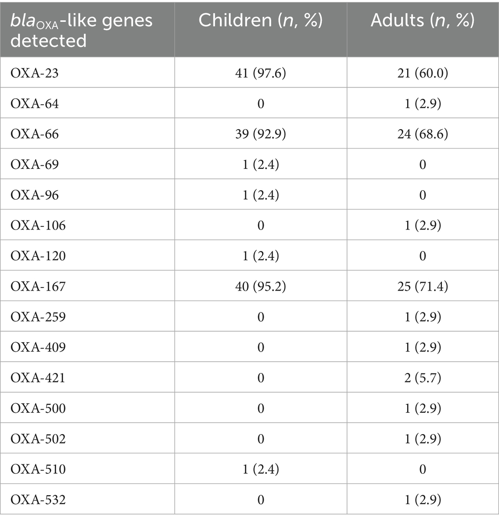 The rapid development of antibiotic resistance and/or multidrug resistance patterns has attracted global attention (Nogbou et al., 2022), with significant differences in the sensitivity to antimicrobial agents and the infection rates in epidemics (Table 1). Our data show that the resistance rate to carbapenem antibiotics is as high as 83.1% for all strains, which is consistent with the results of earlier studies (Nogbou et al., 2021). The resistance rates for adults and children are 65.7 and 97.6%, respectively. Several factors may explain this discrepancy: First, identifying pathogens early in critically ill children is challenging, making them more likely to receive broad-spectrum antibiotics such as carbapenems and broad-spectrum cephalosporins as empirical therapy. Second, children in PICUs—particularly neonates and infants—possess immature immune systems and frequently require antibiotics alongside invasive devices like central venous catheters and ventilators. This environment facilitates bacterial adaptation into low-metabolism persister populations, which exhibit heightened resistance to carbapenems and cephalosporins. Resistance gene clusters are enriched in pediatric isolates. For instance, this study found pediatric patients frequently carried the blaOXA-23 carbapenemase gene (97.6%) and OXA-167 (OXA-23-like, 95.2%). Previous studies have demonstrated that OXA-23-like enzymes are the most prevalent acquired carbapenemases in A. baumannii, conferring high-level resistance to carbapenems (Evans and Amyes, 2014), while OXA-51-like, though intrinsic, can significantly enhance resistance when combined with insertion sequences such as ISAba1 (Chan et al., 2022; Brown et al., 2005). It is worth noting that although the imipenem resistance rate of adult isolates is lower than that of children, adult isolates exhibit a more diverse spectrum of OXA-type carbapenemases compared to pediatric isolates such as OXA-259, OXA-409, OXA-421, OXA-500, OXA-502, and OXA-532. This may stem from heterogeneity in the genetic background of adult-derived A. baumannii clones within AbaR/AbGRI-type resistance islands and transposable elements like ISAba1/Tn2006, which carry different blaOXA genes. This heterogeneity amplifies the diversity of detectable OXA-type carbapenemases within the same healthcare facility (Douraghi et al., 2020). Concurrently, studies indicate that high resistance rates in pediatric ICUs are primarily driven by the expansion of a single clone, such as GC2, carrying blaOXA-23 and enhanced by upstream expression via ISAba1. While this increases overall carbapenem resistance rates, it reduces OXA-type diversity due to clonal homogeneity (Yousefi Nojookambari et al., 2021). In addition, we identified a novel sequence type (ST-) pediatric isolate (C-ab14) harboring NDM-1, OXA-58, and OXA-510 simultaneously, but notably lacking OXA-23. Although previous reports have documented the coexistence of NDM-1 and OXA-58 in individual cases (Rodrigues et al., 2024), the combination of these three carbapenemase genes within a novel ST has not been previously described.
