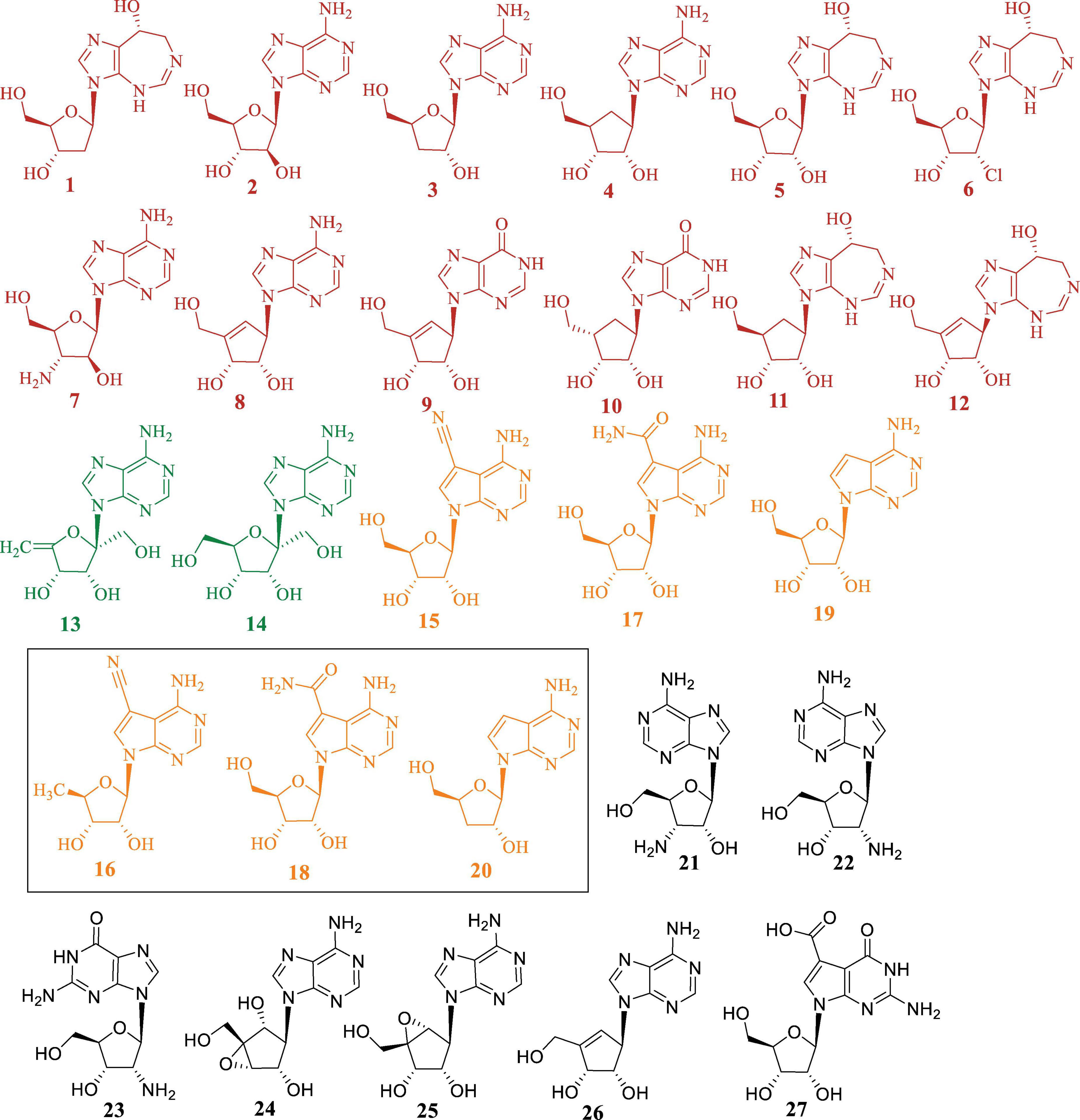 Figure 1. Chemical structures of representative purine-derived N-nucleoside antibiotics discussed in this review. Compounds are categorized and color-coded by structural class: red (1-12): pentostatin-related nucleosides, green (13, 14): angustmycins, orange (15-20): pyrrolopyrimidine nucleosides, black (21-27): other purine nucleoside analogs are discussed in detail in Section “2.4 N-NAs without Identified BGCs,” along with their names and corresponding references. The chemically synthesized analogues are highlighted with rectangular box.