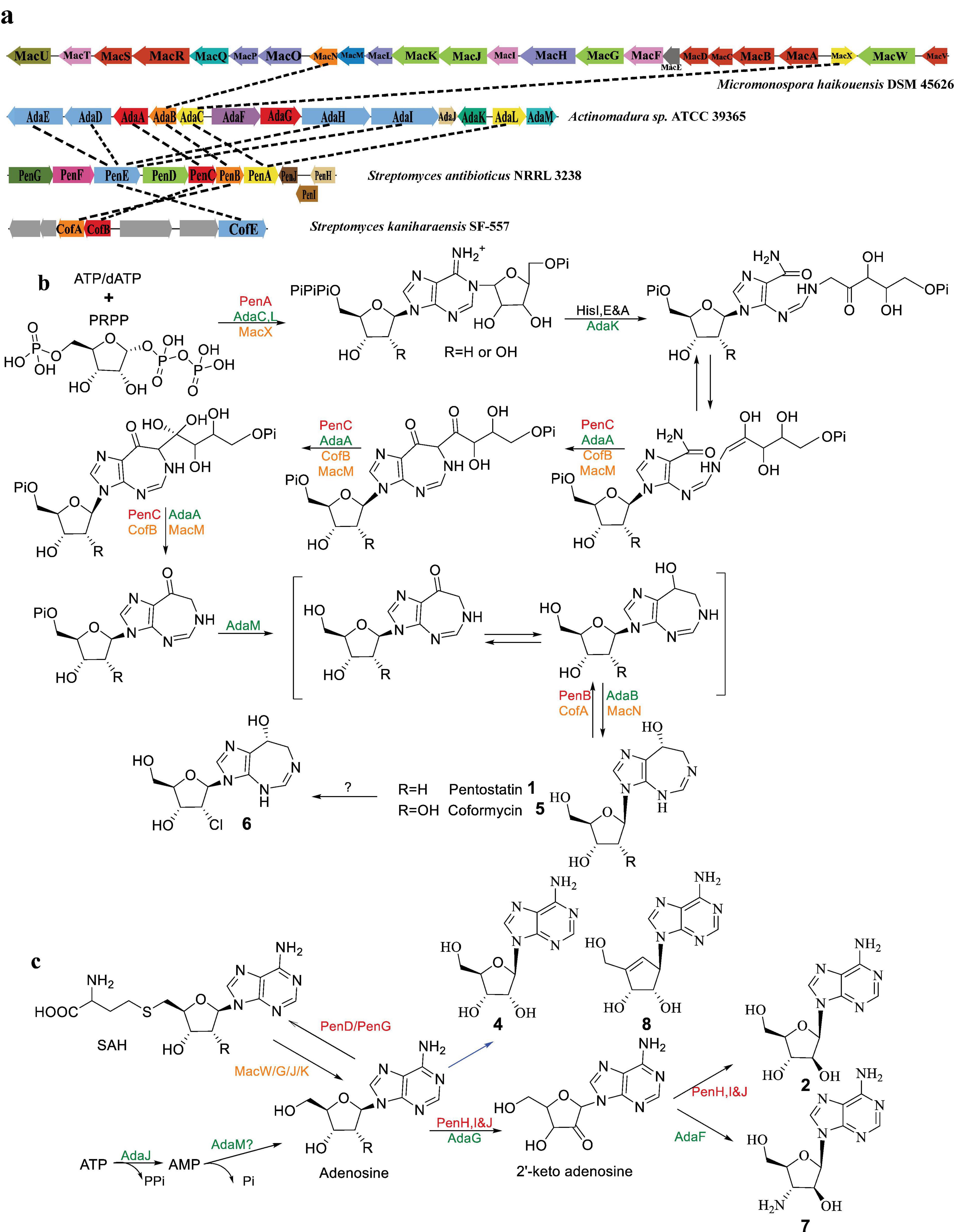 Xu, G., Kong, L., Gong, R., Xu, L., Gao, Y., Jiang, M., et al. (2018). Coordinated biosynthesis of the purine nucleoside antibiotics aristeromycin and coformycin in actinomycetes. Appl. Environ. Microbiol. 84:e01860-18. doi: 10.1128/aem.01860-18