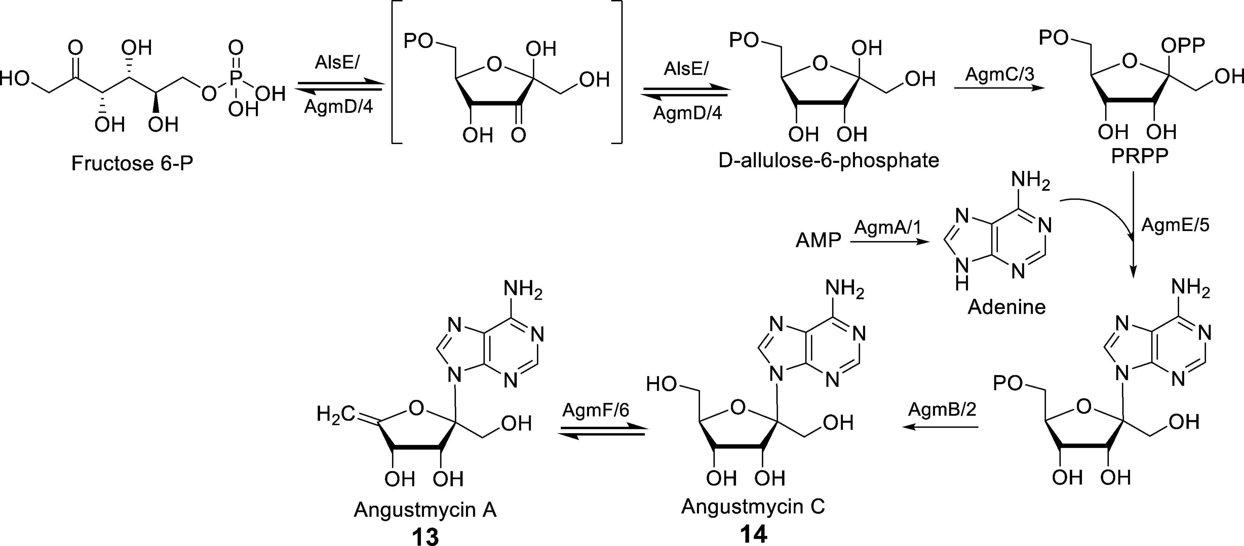 In the study conducted by Yu et al. (2021), the cluster agm, which is responsible for the synthesis of AGMs, was directly cloned from S. angustmyceticus JCM 4053. This cluster has a total length of 9.8 kb and consists of 9 genes, namely agmA-E, agmR, and agmT1/T2. The successful heterologous expression of the agm cluster was achieved in Streptomyces coelicolor M154, allowing for the analysis of the AGM synthesis pathway. The function of AgmA was determined to be AMP phosphoribohydrolase. In vitro experiments confirmed that AgmA utilizes AMP/dAMP as a substrate to produce adenine, thus enabling the synthesis of AGMs. AgmB has been demonstrated to possess AMP phosphatase activity, facilitating the conversion of AMP to adenosine. AgmC functions as a ribose 5-P pyrophosphokinase, catalyzing the conversion of ATP to AMP during the synthesis of AGMs. AgmD is presumed to exhibit a 3-epimerase function akin to AlsE, while AgmE acts as a phosphoallulosyltransferase, playing a role similar to APRTase in AGMs biosynthesis. Notably, a particularly intriguing step in the AGMs synthesis pathway involves the final dehydration reaction carried out by AgmF, resulting in the dehydration of 14 to yield 13. When 14 is utilized as a substrate for the purpose of verifying the enzymatic reaction of AgmF, it is observed that the substrate undergoes incomplete transformation during the conversion to 13. Consequently, it can be inferred that the dehydration reaction mediated by AgmF is reversible, as depicted in Figure 3 (Shiraishi et al., 2021; Yu et al., 2021).