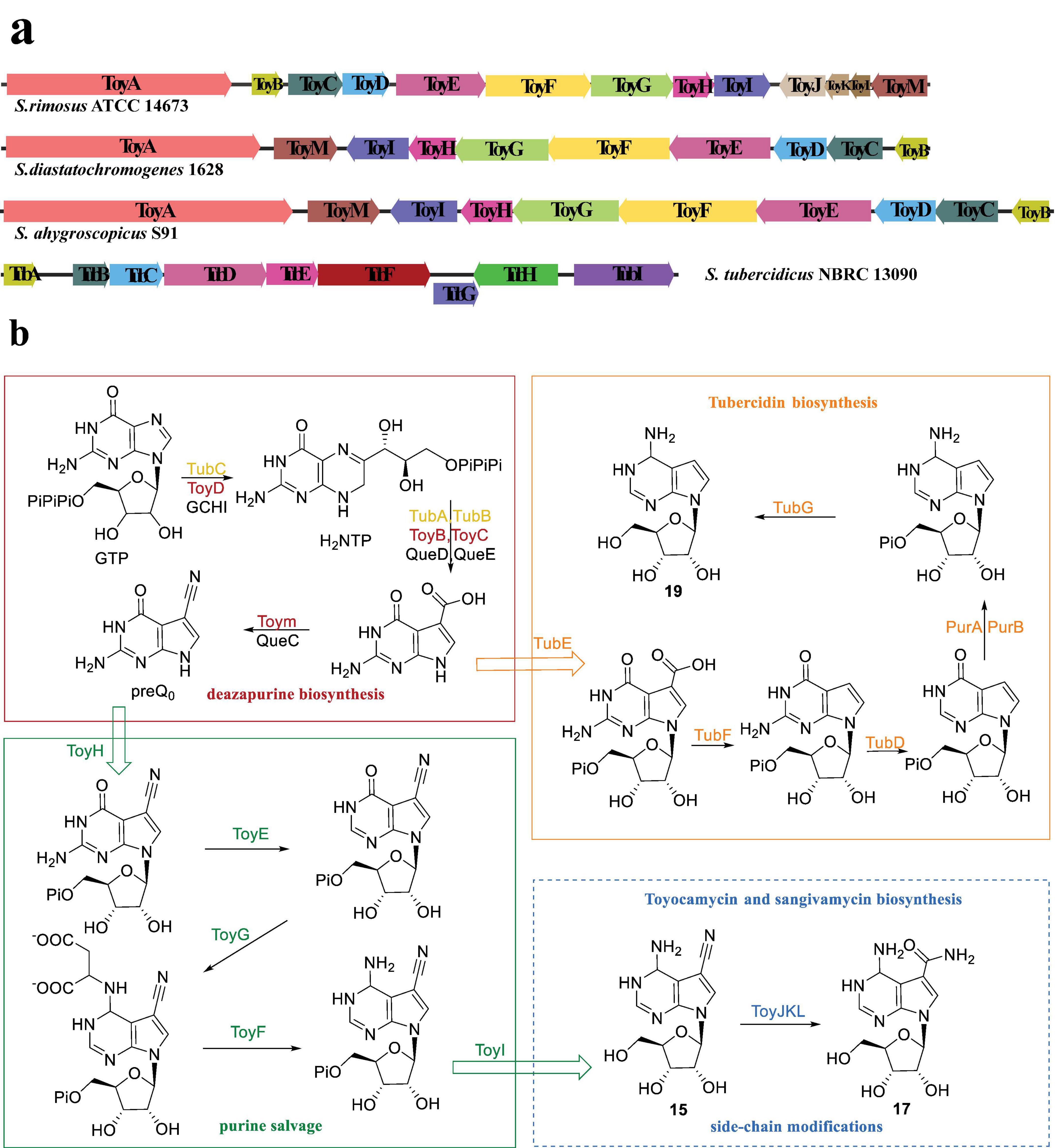 Figure 4. Gene clusters and the biosynthetic pathways of pyrrolopyrimidine nucleosides analogous (Adapted from references: McCarty and Bandarian, 2008; Xu et al., 2019; Liu et al., 2018). (a) The toy and tub gene clusters derived from S. rimosus ATCC14673, S. diastatochromogenes 1628, S. ahygroscopocus S91, and S. tubercidicus NBRC13090, respectively, where genes of the same color represent homologous functions. (b) Color-coded functions in the biosynthetic pathway; red box denotes the deazapurin biosynthesis stage in the production of compound 15, green box represents the purine salvage stage, blue dotted box is solely relevant to the biosynthesis of 17, orange box is associated with the biosynthesis of 19, and the enzymes marked black are involved in PreQ0 biosynthesis.