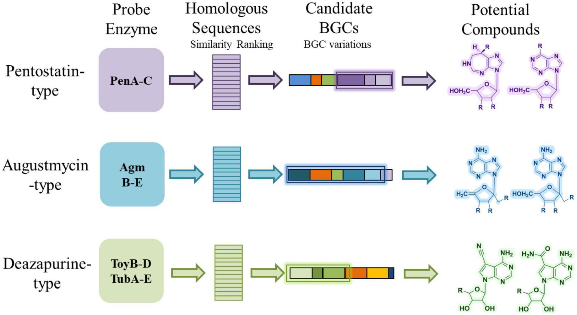 A widely used approach in genome-guided discovery of natural products is to employ experimentally characterized core enzymes as sequence probes to identify homologous BGCs (Shi et al., 2019; Bauman et al., 2021). For example, the pen BGC and the mac BGC mentioned in Section “2 Bioactivity and biosynthesis of purine-derived N-nucleoside antibiotics” were both identified by using their respective core enzyme as sequence probes (Wu et al., 2017; Xu et al., 2018). This strategy has been successfully applied to various classes of secondary metabolites and is increasingly used for nucleoside antibiotics (Du et al., 2023). By focusing on enzymes that are essential for scaffold construction and contain conserved catalytic motifs, researchers can retrieve candidate BGCs from genome databases and generate hypotheses about the possible products encoded by these clusters (Figure 5).