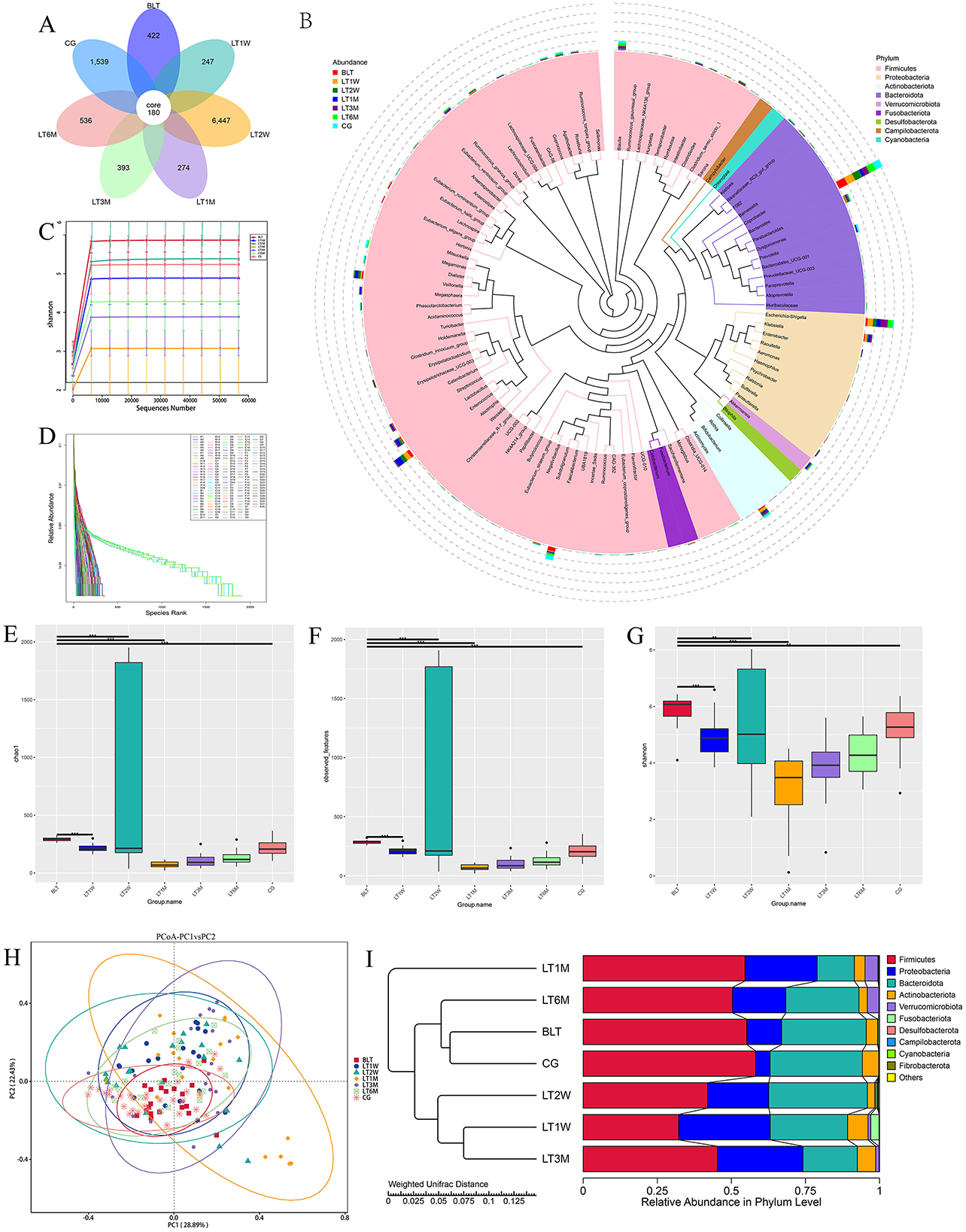 Figure 1. Results of 16S rRNA sequencing, α diversity and β diversity results. (A) Venn diagram; (B) Genus level species evolutionary tree; (C) Sample dilution curve of each group during perioperative period of liver transplantation; (D) Sample abundance curve of each sample during perioperative liver transplantation; (E) chao1 index; (F) Observation feature index; (G) Shannon index (* indicates p < 0.05; ** means p < 0.01; *** means p < 0.001); (H) The diversity analysis results showed; (I) UPGMA cluster analysis diagram based on PCoA analysis results.