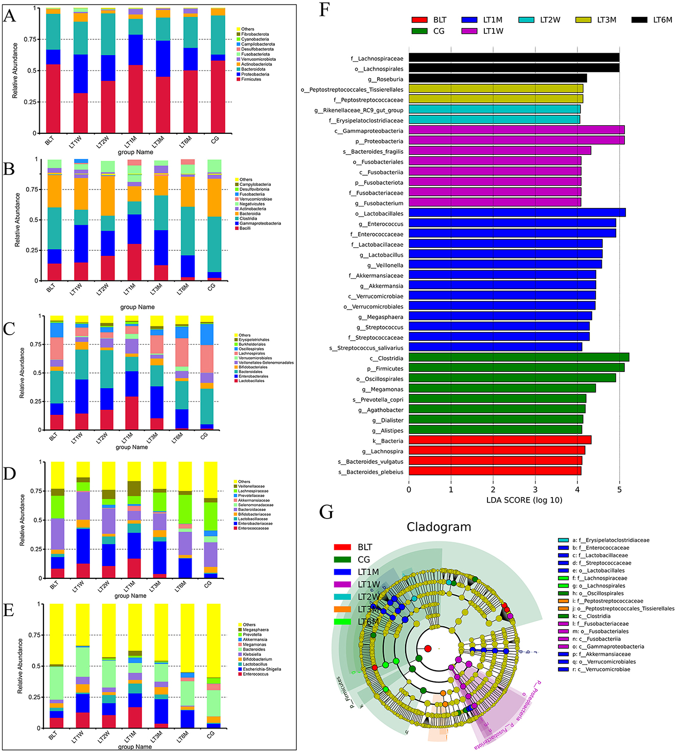 We selected Metagenomic sequencing samples using the Discriminant method in microPITA (Supplementary Figure S1). We chose six samples from the central position of each group, for a total of 42 samples, and then performed metagenomic sequencing. The samples selected from the BLT group were designated as Group A, samples from the LT1W group as Group B, samples from the LT2W group as Group C, and samples from the LT1M group as Group D, The samples from LT3M group as Group E; The samples from group LT6M as Group S; The samples from group GC to Group G.