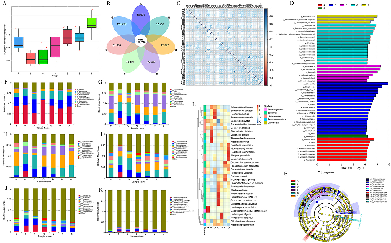Based on the 16S rRNA sequencing results, we selected six samples from each group using the microPITA Discriminant method, with samples located at the central position (Supplementary Figure S2), totaling 42 samples, for metagenomic sequencing. A total of 1,693,767 gene catalogs (unigenes) were obtained, and a box plot was generated to visualize their distribution (Figure 3A). And we constructed a Venn diagram (Figure 3B) to observe the distribution of gene counts across the seven groups and analyze the shared and unique gene information among different samples (groups),. The total number of shared genes among the seven groups was 156,746. The BLT group (A group) had 88,974 unique genes, the LT1W group (B group) had 17,958 unique genes, the LT2W group (C group) had 47,927 unique genes, the LT1M group (D group) had 27,307 unique genes, the LT3M group (E group) had 71,427 unique genes, the LT6M group (S group) had 51,384 unique genes, and the GC group (G group) had 128,728 unique genes. The results showed that the GC group had the highest gene count among the seven groups, while the LT1W group had the lowest, indicating a significant impact of liver transplantation on the gut microbiota of the patients. Correlation analysis between samples was conducted based on gene count (Figure 3C) to assess the reliability of the experiment and the rationality of sample selection. We observed that, except for the C group, which showed a weaker correlation, all other groups exhibited a strong positive correlation, suggesting that the sample selection was both reasonable and effective.