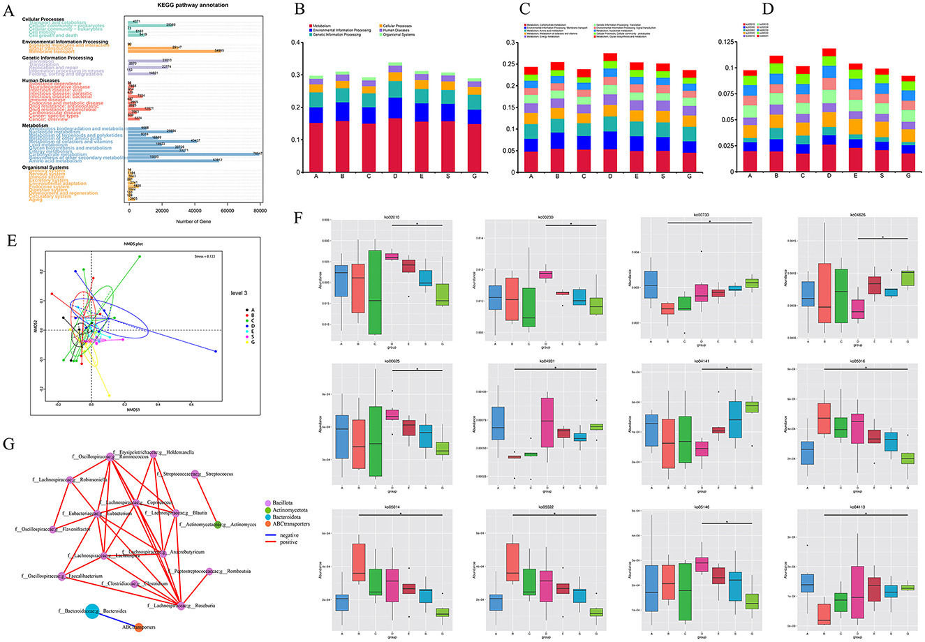 Figure 4. KEGG function results after metagenomic sequencing. (A) KEGG LEVEL 1 function distribution of all samples; (B) Distribution of KEGG LEVEL 1 in each group during perioperative period of liver transplantation; (C) Distribution of KEGG LEVEL 2 in each group during perioperative period of liver transplantation; (D) Distribution of KEGG LEVEL 3 in each group during perioperative period of liver transplantation; (E) NMDS analysis based on functional abundance; (F) Metastat analysis of functional differences among KEGG LEVEL 3 groups (top 12); (G) Correlation network analysis of ko02010 specific functional pathways and related genera (* means p < 0.05).