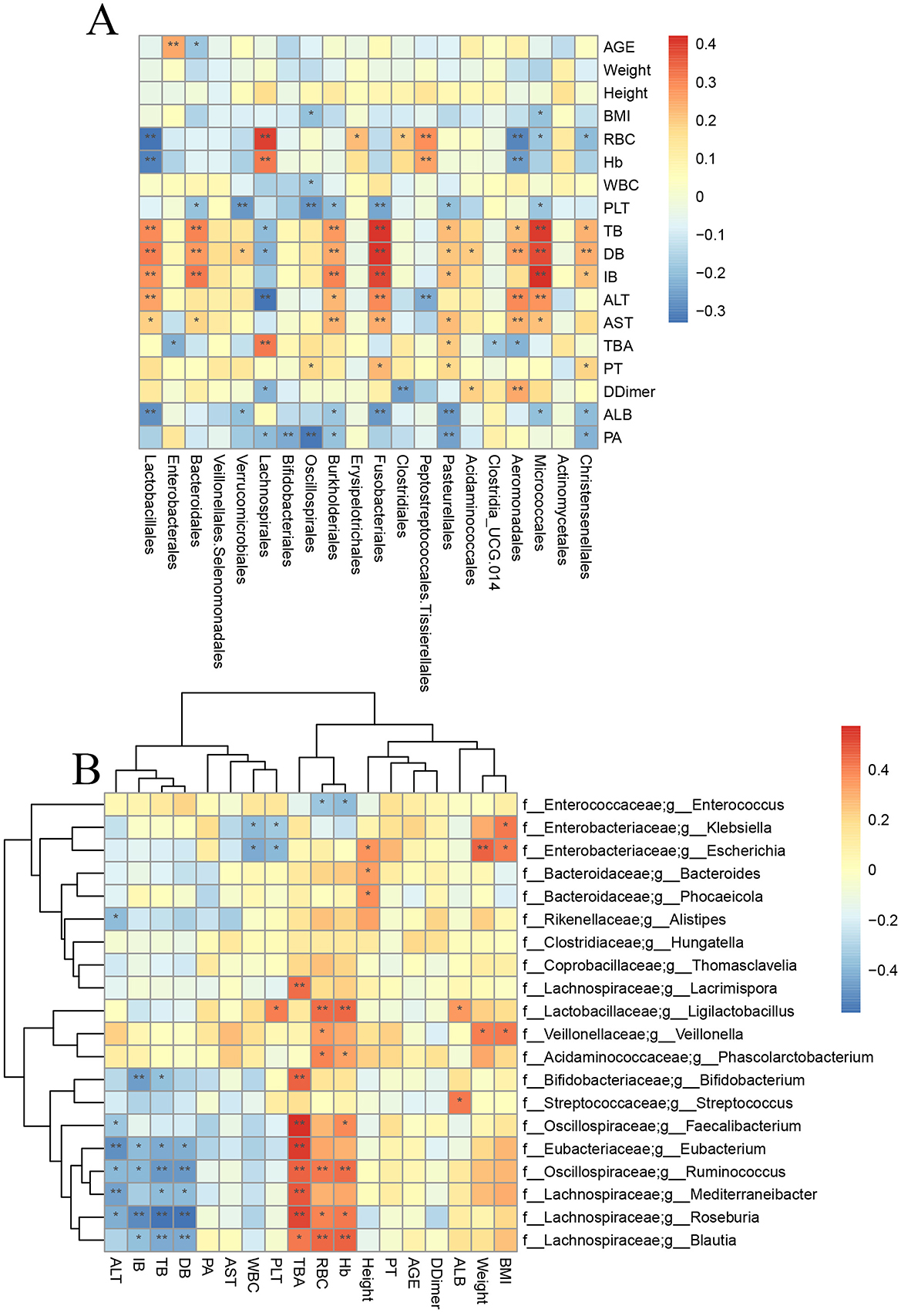 Figure 5. Correlation analysis between specific bacteria and clinical indicators. (A) Correlation analysis between 16s rRNA sequencing results and clinical indicators. (B) Correlation analysis between metagenomic sequencing results and clinical indicators (* means p < 0.05; ** means p < 0.01).