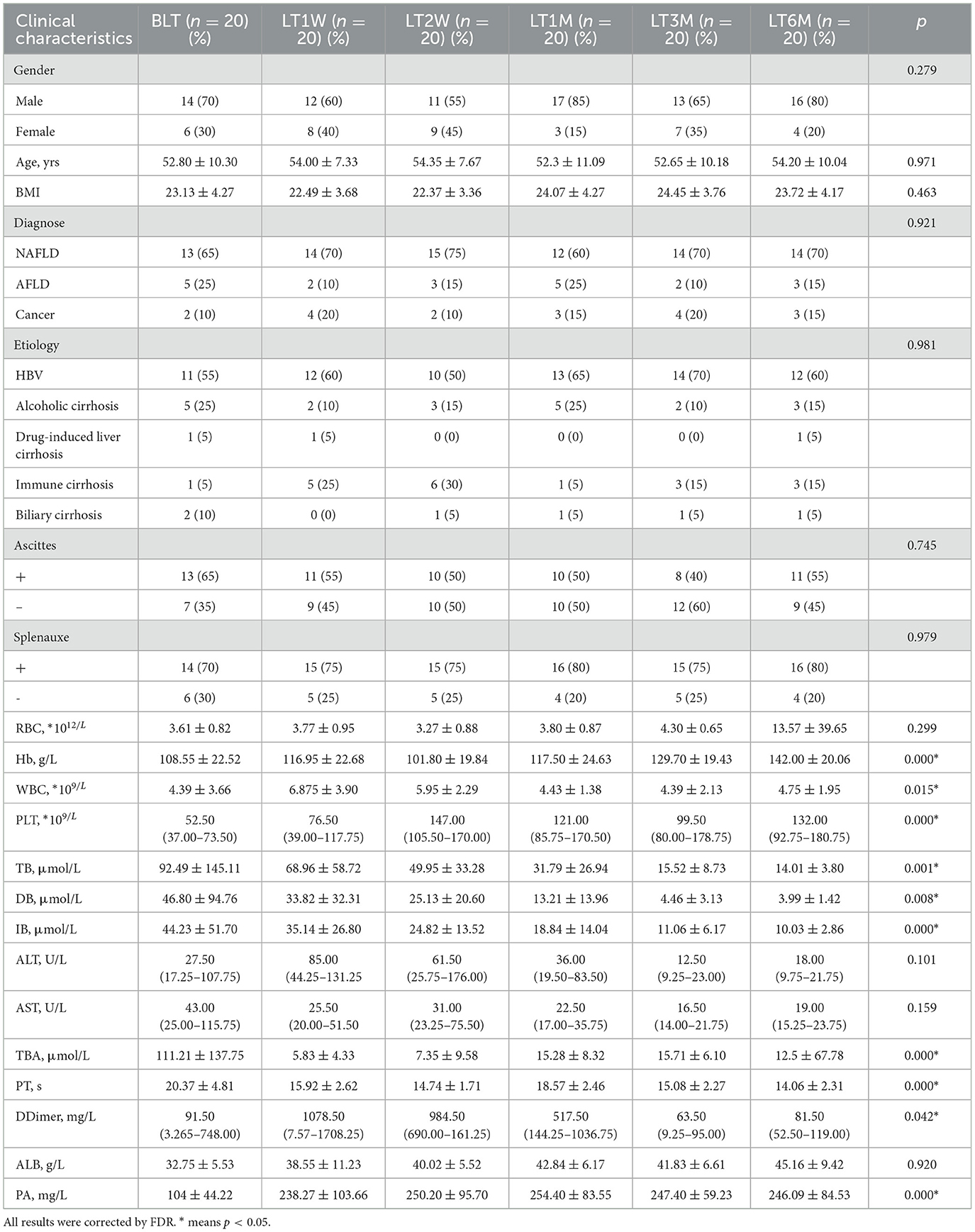 This study collected 120 fecal samples from 59 liver transplant patients during the perioperative period and postoperative period at the First Hospital of Shanxi Medical University between 2021 and 2023, as well as 31 samples from a control group. All 31 control group samples were selected from the patients' family members (such as spouses, brothers, etc.) as the sampling subjects. Exclusion criteria are as follows: (1) patients with concomitant inflammatory bowel disease, gastrointestinal tumors, or other organ diseases; (2) patients who had used antibiotics within 1 month prior to surgery and who were readmitted or used antibiotics again due to unstable conditions after surgery; and (3) patients who did not receive the same immunosuppressive regimen, which includes tacrolimus, sirolimus, mycophenolate mofetil, and methylprednisolone. All liver transplant patients who were treated with broad-spectrum antibiotics (such as cefoperazone sulbactam sodium, meropenem) during the operation and for 3 weeks after the operation were required to stop using them before discharge. Immunosuppressive therapy is a combined treatment approach of multiple immunosuppressants, mainly calcineurin inhibitors and mycophenolic acid inhibitors. We regularly follow up on the tacrolimus blood concentration of patients after the operation and adjust the target blood concentration range in a timely manner. It is 8–12 ng/mL in the first 3 months after transplantation and 7–10 ng/mL in 3–6 months. It is 6–8 ng/mL for 6–12 months. Following standardized protocols, all stool samples were put into sterile containers to immediately snap-frozee in liquid nitrogen within 4 h of collection and subsequently refrigerated at −80 °C. The study design and procedures complied with the Declaration of Helsinki, and the research protocol was approved by our hospital's ethics committee. We grouped the 151 samples as follows: before-liver transplantation (BLT: 20); 1 week post-liver transplantation (LT1W: 20); 2 week post-liver transplantation (LT2W: 20); 1 month post-liver transplantation (LT1M: 20); 3 month post-liver transplantation (LT3M: 20); 6 month post-liver transplantation (LT6M: 20); and healthy controls (GC: 31).