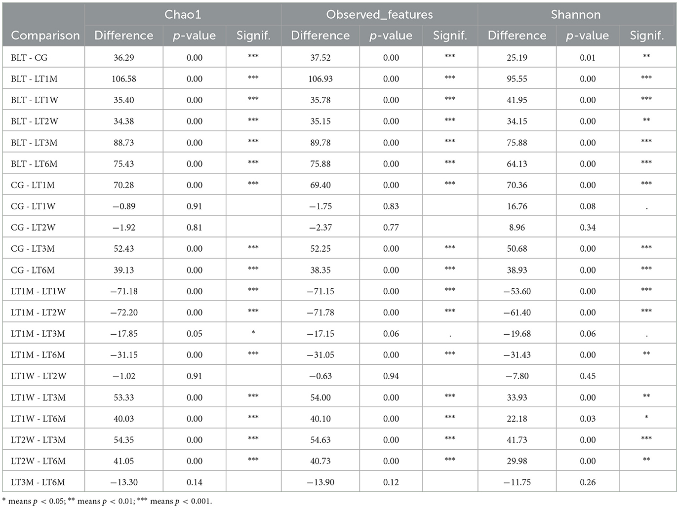 We compared all the detected ASVs with the KEGG database for functional prediction analysis to assess the differences in metabolic pathways between the groups. After performing a T-test, we generated a map (Supplementary Figure S1) to further compare the compositional components of functional genomics in the KEGG pathways. Compared to the control group, the BLT group had eight significantly enriched modules, the LT1W group had 11, the LT2W group had 11, the LT1M group had 16, the LT3M group had eight, and the LT6M group had three. From these findings, it can be concluded that the LT1M group exhibited the highest enrichment of functional modules compared to the control group, while the LT6M group showed the lowest enrichment of functional modules.