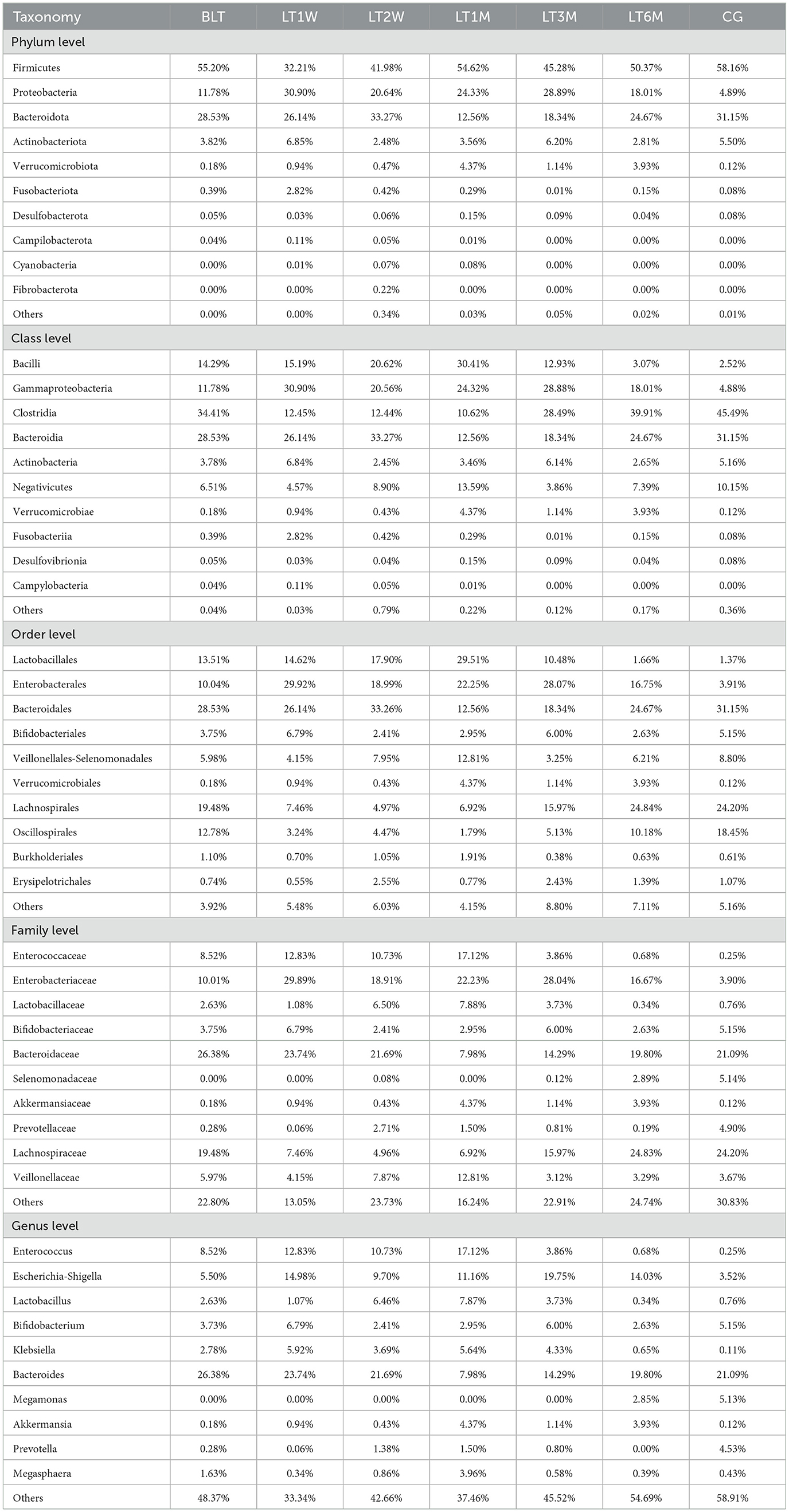 Alpha diversity was analyzed by using Chao1, Observed features, and shannon diversity index, which, respectively, represent the richness, evenness, and total number of observed species in each group (Figures 1E–G). All three observed indices displayed a “V” shaped pattern. The Chao1, Observed features, and Shannon diversity index were highest in the CG and BLT groups, while the LT1M group exhibited the lowest values. Based on the Kruskal-Wallis (K-W) test (Table 2), we observed significant differences (p < 0.05) between the BLT group and the LT1M group in all three observed indices compared to the other groups. Significant differences (p < 0.05) were observed between the CG group and the LT1M, LT3M, and LT6M groups. However, no significant differences were found between the LT1W and LT2W groups, as well as between the LT3M and LT6M groups. The analysis of alpha diversity effectively reflects the changes in gut microbiota characteristics during the perioperative and postoperative periods in liver transplant patients. Liver transplantation has a significant impact on the diversity and richness of the gut microbiota. Therefore, differences were observed between the BLT group and all other groups. The difference between the BLT and CG groups may be related to liver disease. From 1 week to 1 month after the surgery, a significant decline in gut microbiota diversity and abundance was observed (no significant differences were found between the LT1W and LT2W groups). One month after surgery, these two values reached at their lowest, which may be related to the surgical impact on the patients and the use of antibiotics during their hospital stay. As patients gradually recover, the use of antibiotics and immunosuppressants decreases, leading to a gradual restoration of gut microbiota diversity and abundance (No significant differences were found between the LT3M and LT6M groups). Significant differences remained between the LT6M group and the GC group, which may be related to the long-term use of immunosuppressants. This also suggests that 6 months after the transplantation may not represent the endpoint of gut microbiota recovery in these patients (the composition of key microbiota and alpha diversity). It requires further long-term studies to determine whether the patients' gut microbiota can recover to levels comparable to the CG group. Therefore, for patients with end-stage liver disease, the most significant impact of liver transplantation on the gut microbiota occurs during the period from 1 week to 1 month after the surgery. Moreover, 1 month is the time point at which gut microbiota abundance is at its lowest. Identifying critical time points and maintaining gut microbiota stability during these periods is essential, as it significantly contributes to enhancing postoperative recovery and minimizing complications in liver transplant patients.