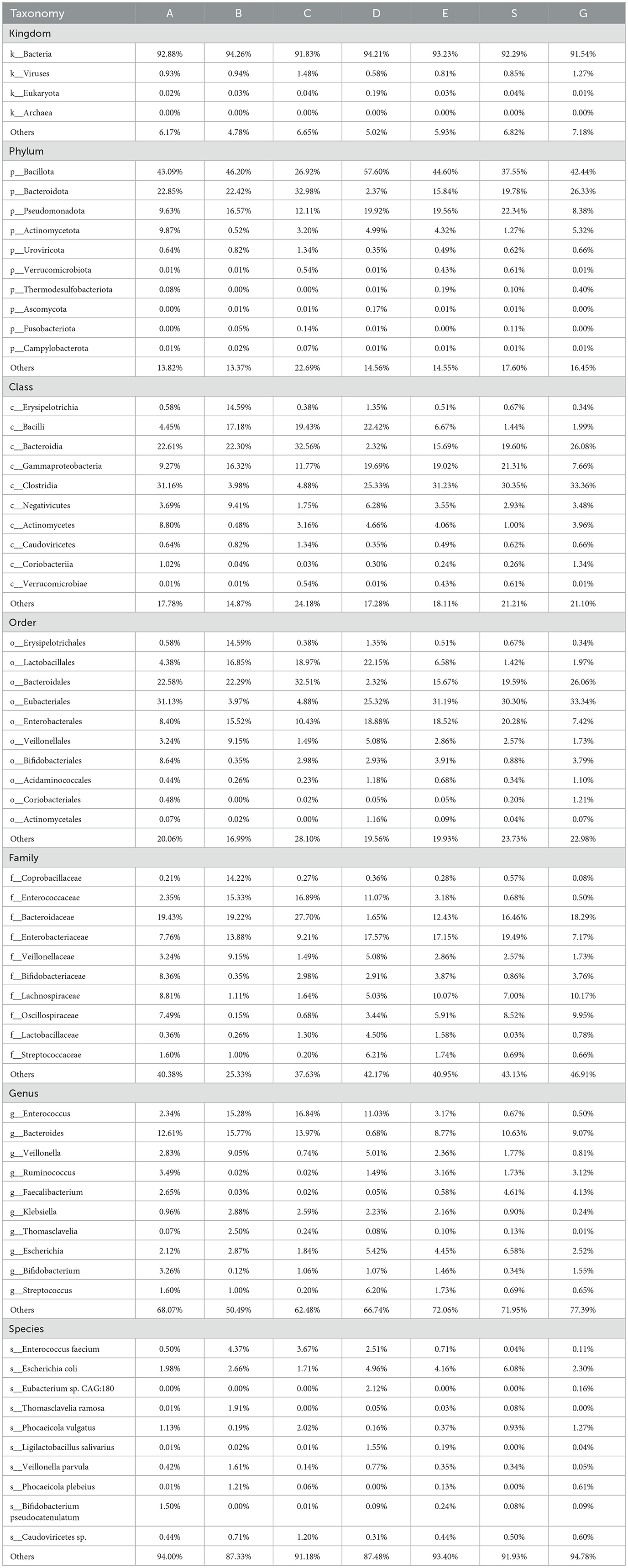 Based on species annotation results at each taxonomic level, we selected the top 10 species with the highest relative abundances at the phylum, class, order, family, and genus levels for each group (Table 3) to plot bar charts that display the relative abundance of species annotation results at different taxonomic levels for each group.