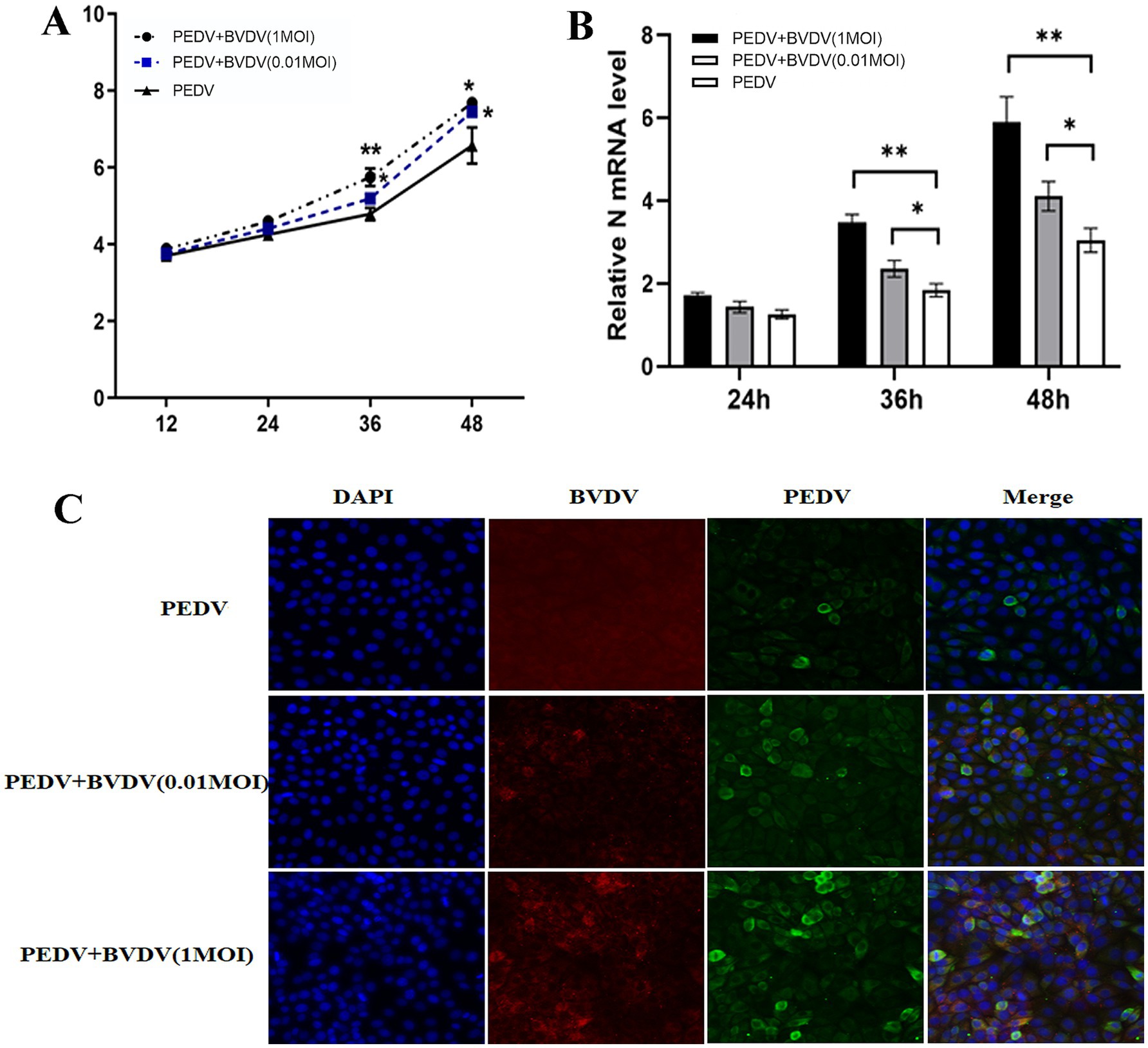 Figure 1. BVDV infection facilitates the proliferation of PEDV. PK15 cells were monoinfected with PEDV, or inoculated with BVDV for 6 h and then infected with PEDV. (A) At 12, 24, 36, and 48 hpi, PEDV virus titers were determined using a TCID50 assay. (B) PEDV N mRNA levels were detected by qPCR at 24, 36, and 48 hpi. (C) At 24 hpi, cells were fixed and stained for IFA. Green, PEDV N protein; red, BVDV E2 protein; blue, DAPI-stained for the nucleus. The results are representative of three independent experiments (*p < 0.05 and **p < 0.01).