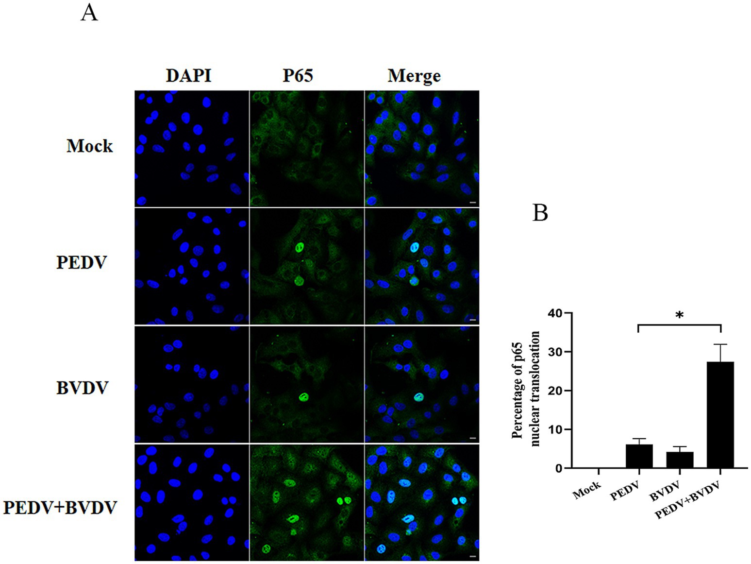 Fluorescence microscopy and bar graph. Panel A shows four rows of microscopy images labeled Mock, PEDV, BVDV, and PEDV+BVDV with columns DAPI, P65, and Merge. Blue and green fluorescence indicates nuclei and P65 protein expression. Panel B presents a bar graph showing the percentage of P65 nuclear translocation, with the highest percentage in the PEDV+BVDV group, marked by an asterisk for statistical significance.
