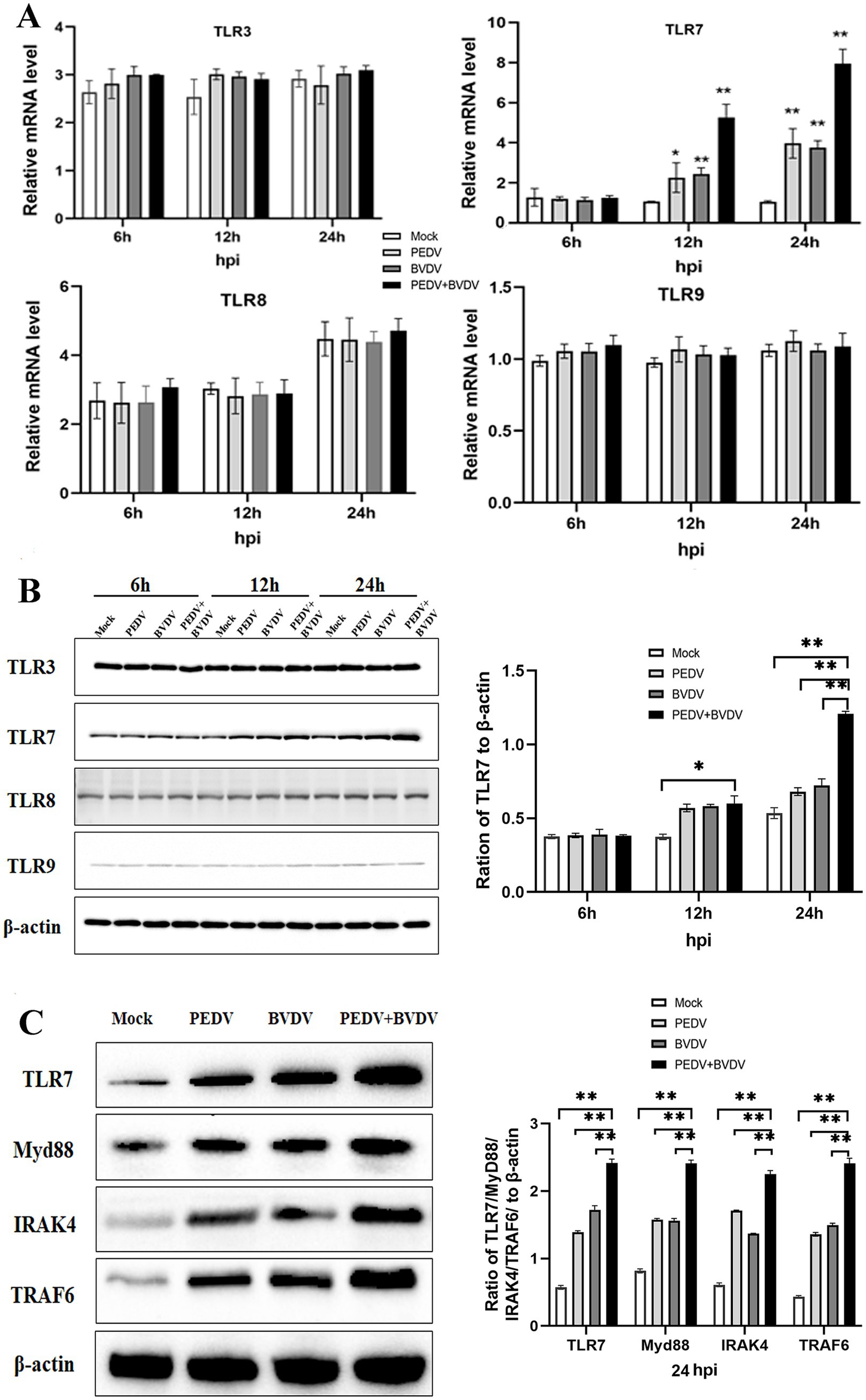 Figure 3. PEDV and BVDV coinfection upregulates TLR7 expression. PK15 cells were monoinfected with PEDV, or coinfected with BVDV at an MOI of 1 for 6, 12, 24 h. (A,B) TLR family members expression was detected via qPCR (A) and Western blotting (B) during the time course of virus infection. (C) TRL7, Myd88, IRAK4, and TRAF6 expression was analyzed via Western blotting at 24 hpi (*p < 0.05 and **p < 0.01).